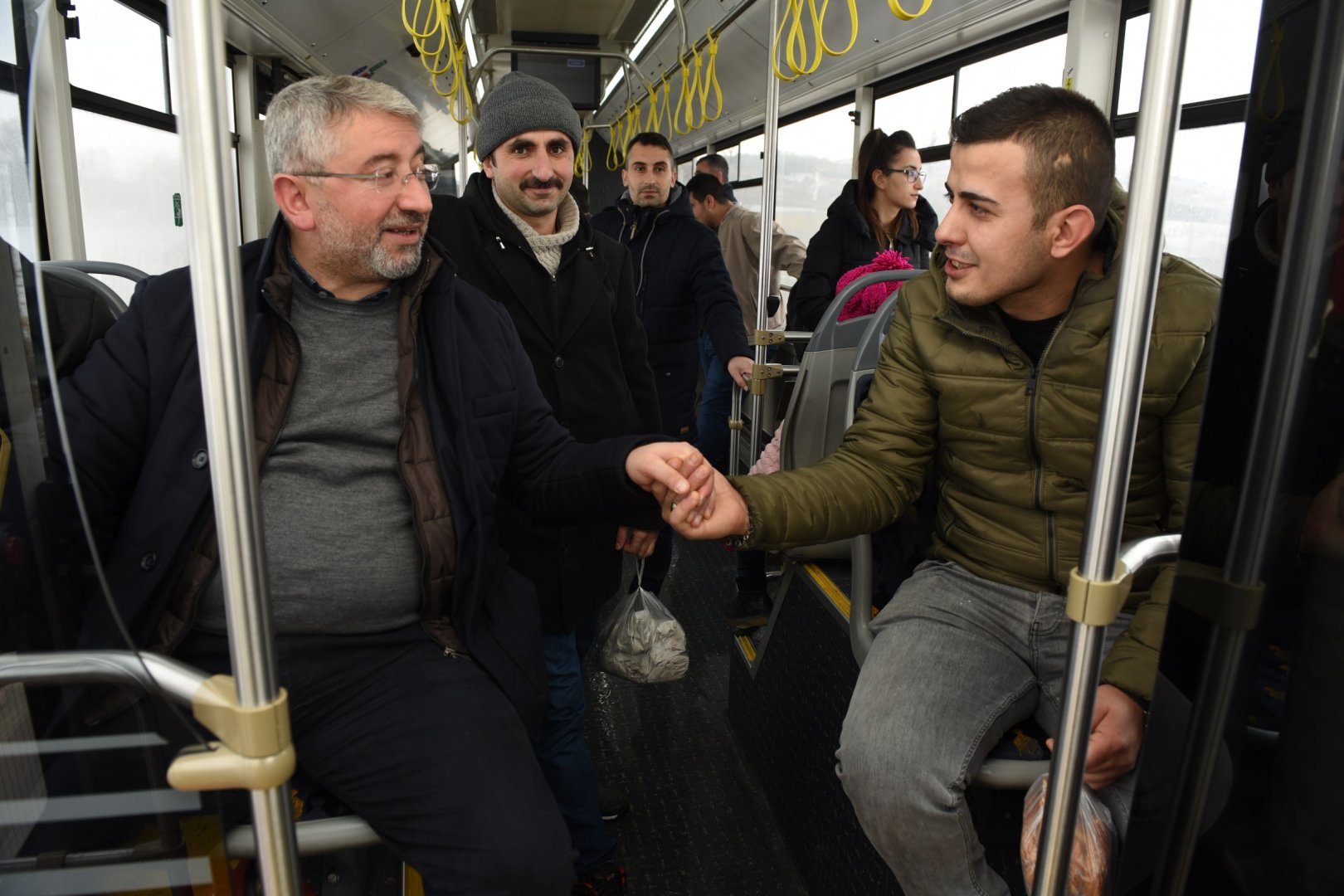 Aşgın halk otobüsüne bindi, yolcularla sohbet etti