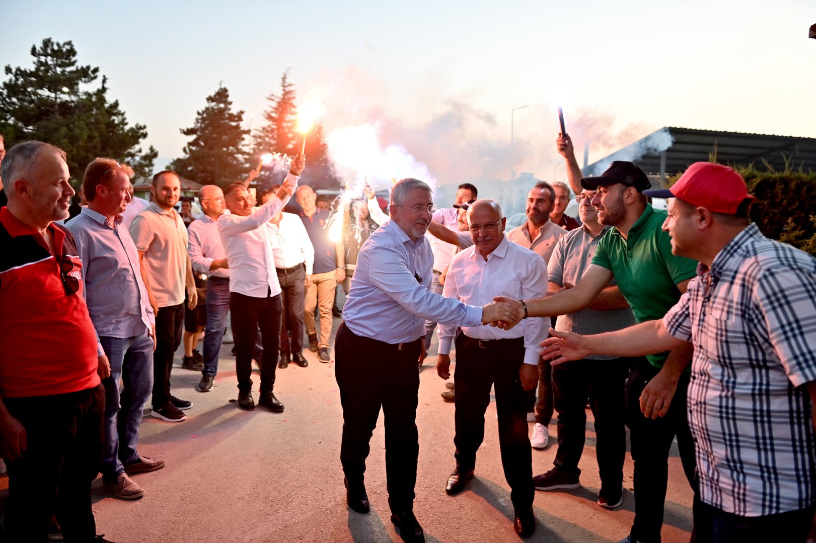 Alana girişte işçiler tarafından konfeti ve meşalelerle