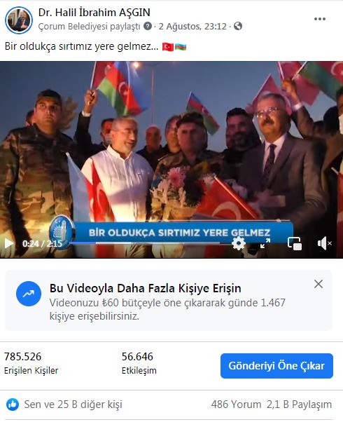 Manavgat’taki yangına müdahale etmek amacıyla Azerbaycan’dan yola çıkan askeri konvoyun Çorum çevre yolunda yakıt ve yiyecek ikmali esnasında karşılayan Başkan Aşgın’ın “Bir oldukça sırtımız yere gelmez” başlığıyla yayınladığı paylaşım 25 binden fazla beğeni aldı. Başkan Aşgın’ın paylaşımı 2100 kişi tarafından da paylaşılırken yaklaşık 800 bin kişiye ulaştı.