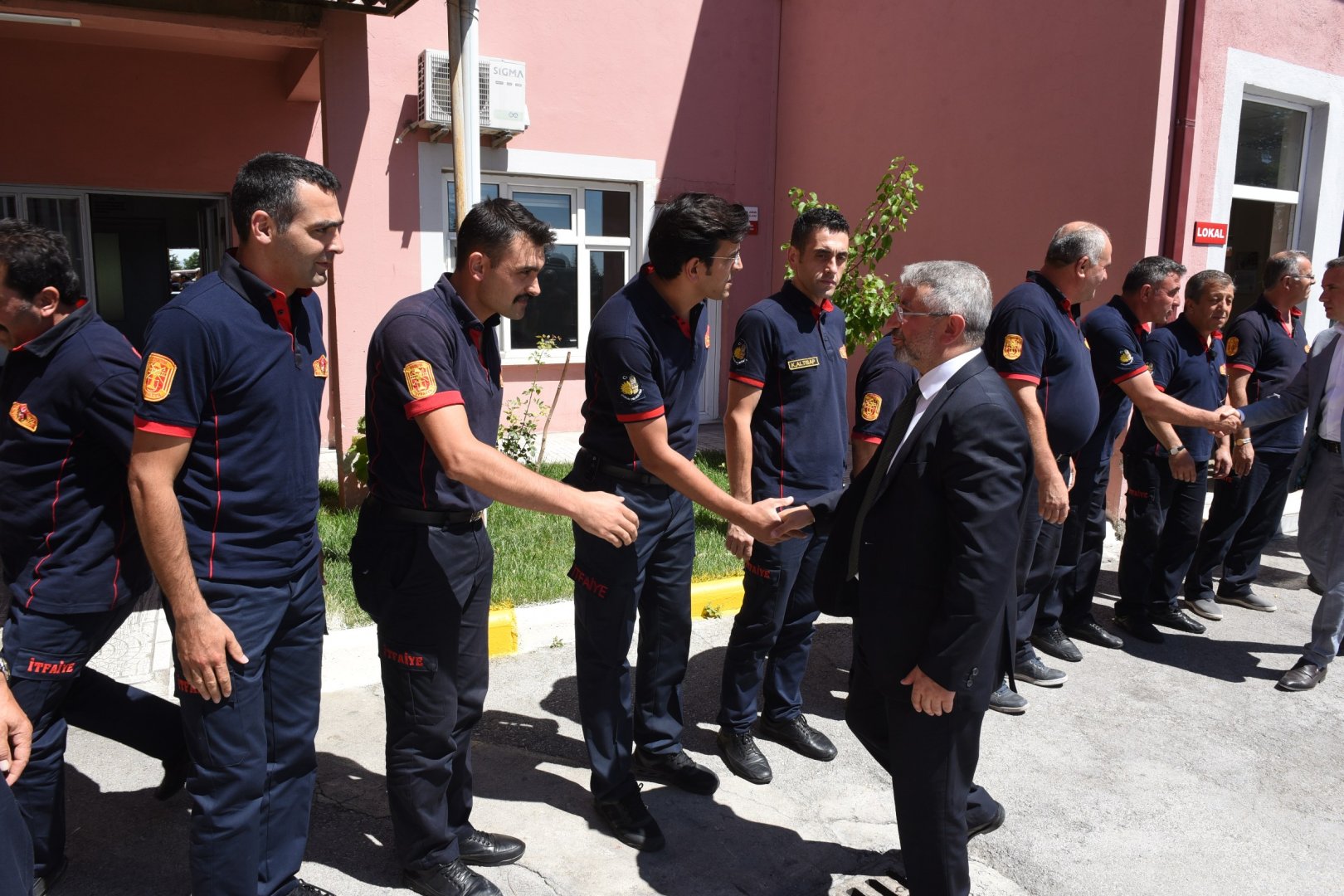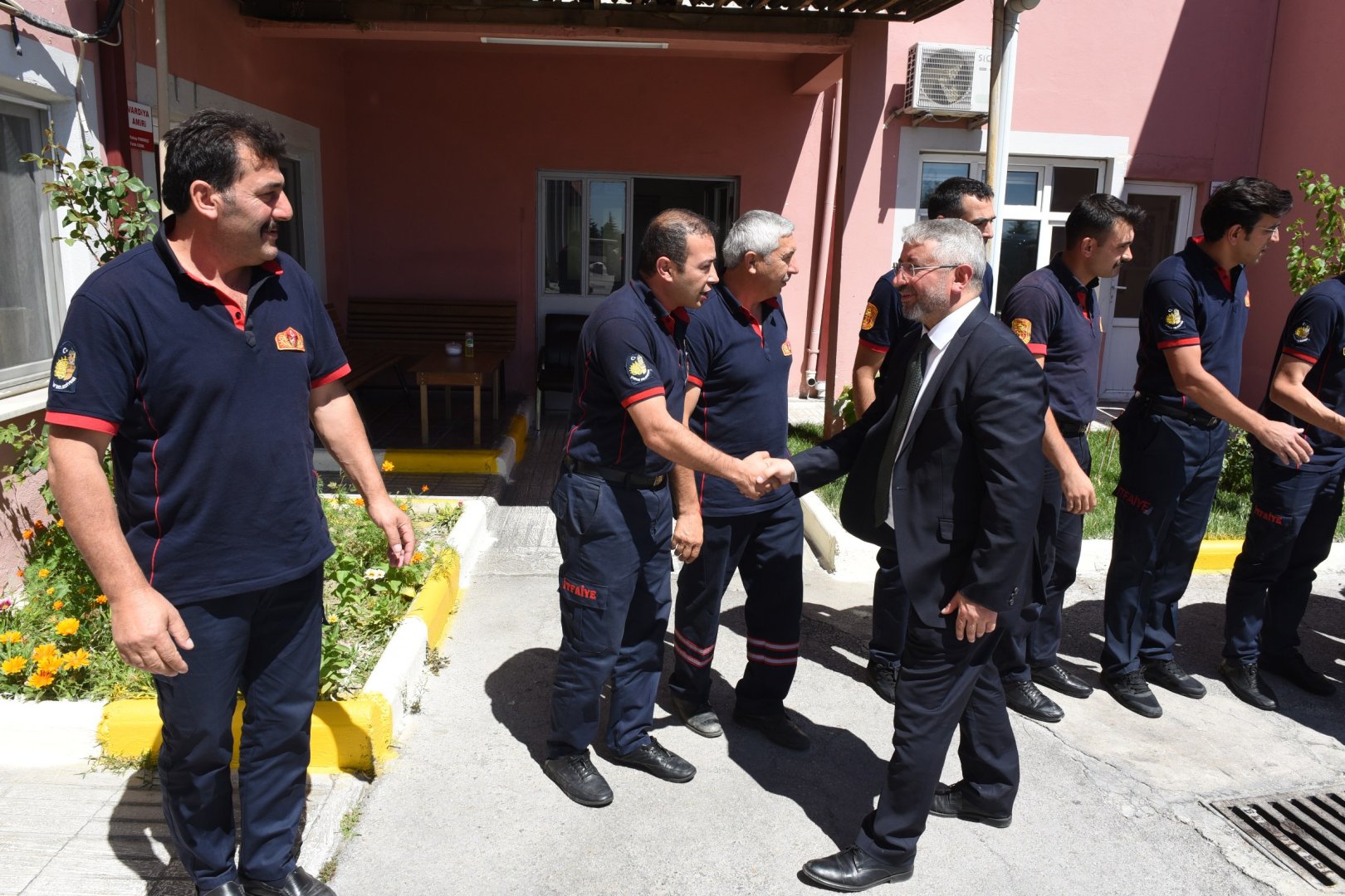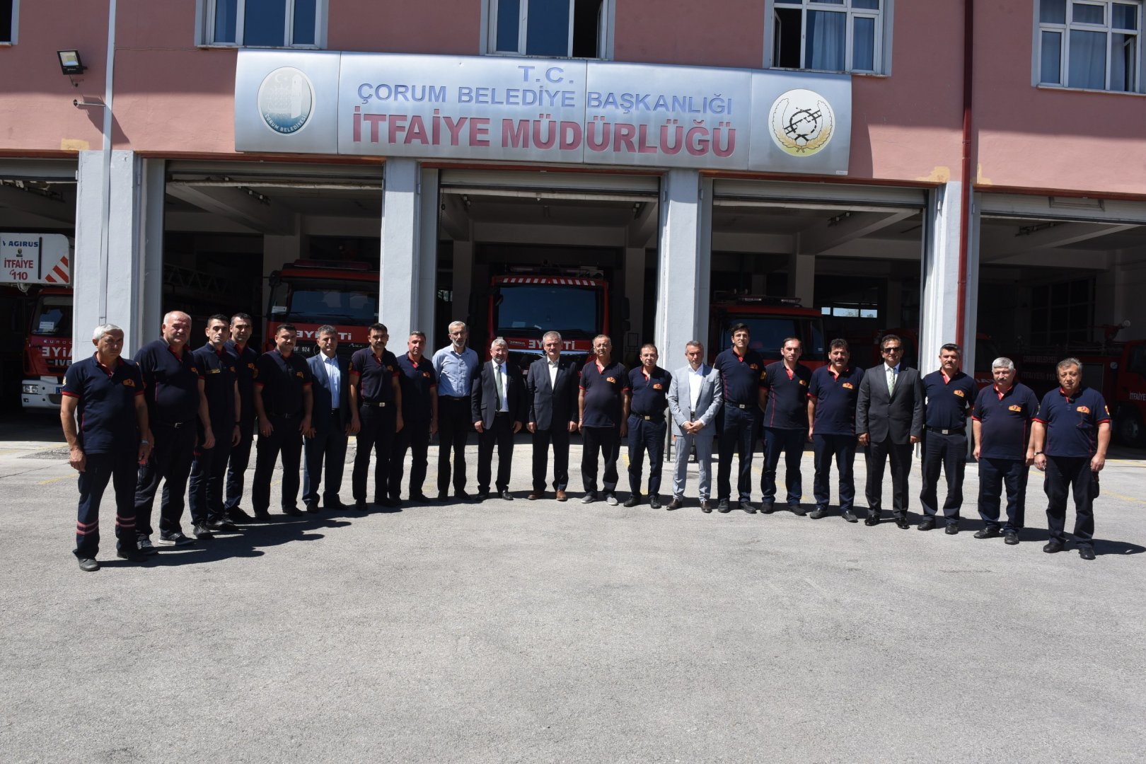 Günün her saatinde çalışan İtfaiye ve Su Kanalizasyon Müdürlüğü’ne ziyaret gerçekleştiren Belediye Başkanı Dr. Halil İbrahim Aşgın personelin bayramını kutladı. Çorum Belediyesi ekiplerinin tatil günlerinde bile yoğun mesai ile çalıştığını ifade eden Belediye Başkanı Dr. Halil İbrahim Aşgın “Kurban Bayramında hemşehrilermizin sıkıntı yaşamaması, bayramlarını daha güzel geçirmeleri için ekiplerimiz çalışmaya devam ediyor. İtfaiye, temizlik, su ve kanalizasyon müdürlüğü ekiplerimiz bayram gününde mesai halindeler. İtfaiye müdürlüğü ekiplerimiz bayram süresince bir çok olaya müdahale ettiler. Vatandaşlarımızın kaçan kurbanlıklarını kaçtıkları yerden kurtarma olayından ev yangınlarına kadar yoğun bir mesai harcadılar. Yine temizlik müdürlüğü ekiplerimiz Türkiye’nin en temiz şehirlerinin başında gelen Çorum’umuzun temiz kalması için 24 saat çalışmaya devam ediyorlar. Su ve Kanalizasyon müdürlüğü ekiplerimiz hemşehrilerimizin mübarek günlerde su ve kanalizasyon sıkıntısı yaşamamaları adına sürekli teyakkuz halindeler. Ben bütün çalışma arkadaşlarımıza bu özverili çalışmalarından dolayı teşekkür ediyorum ve bayramlarını kutluyorum” dedi.