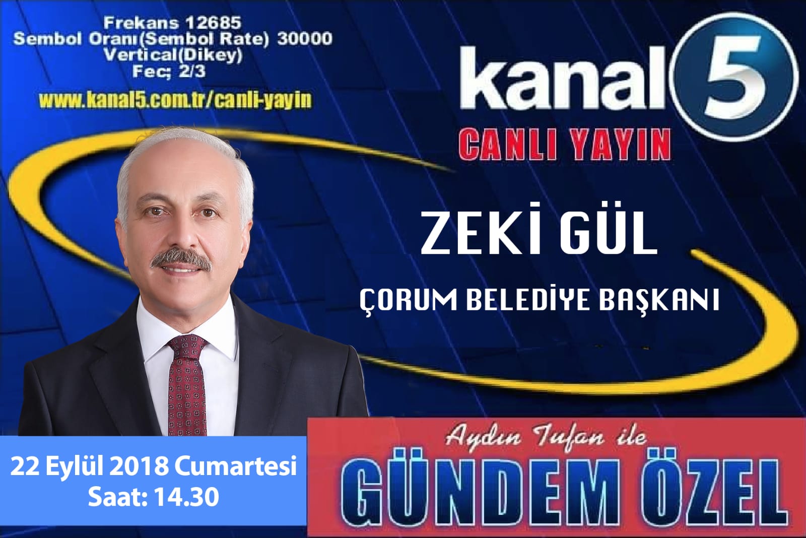 Çorum Belediye Başkanı Zeki Gül, 22 Eylül 2018 Cumartesi günü (yarın), Kanal 5 televizyonunda yayınlanan “Aydın Tufan ile Gündem Özel” programında canlı yayın konuğu olacak.