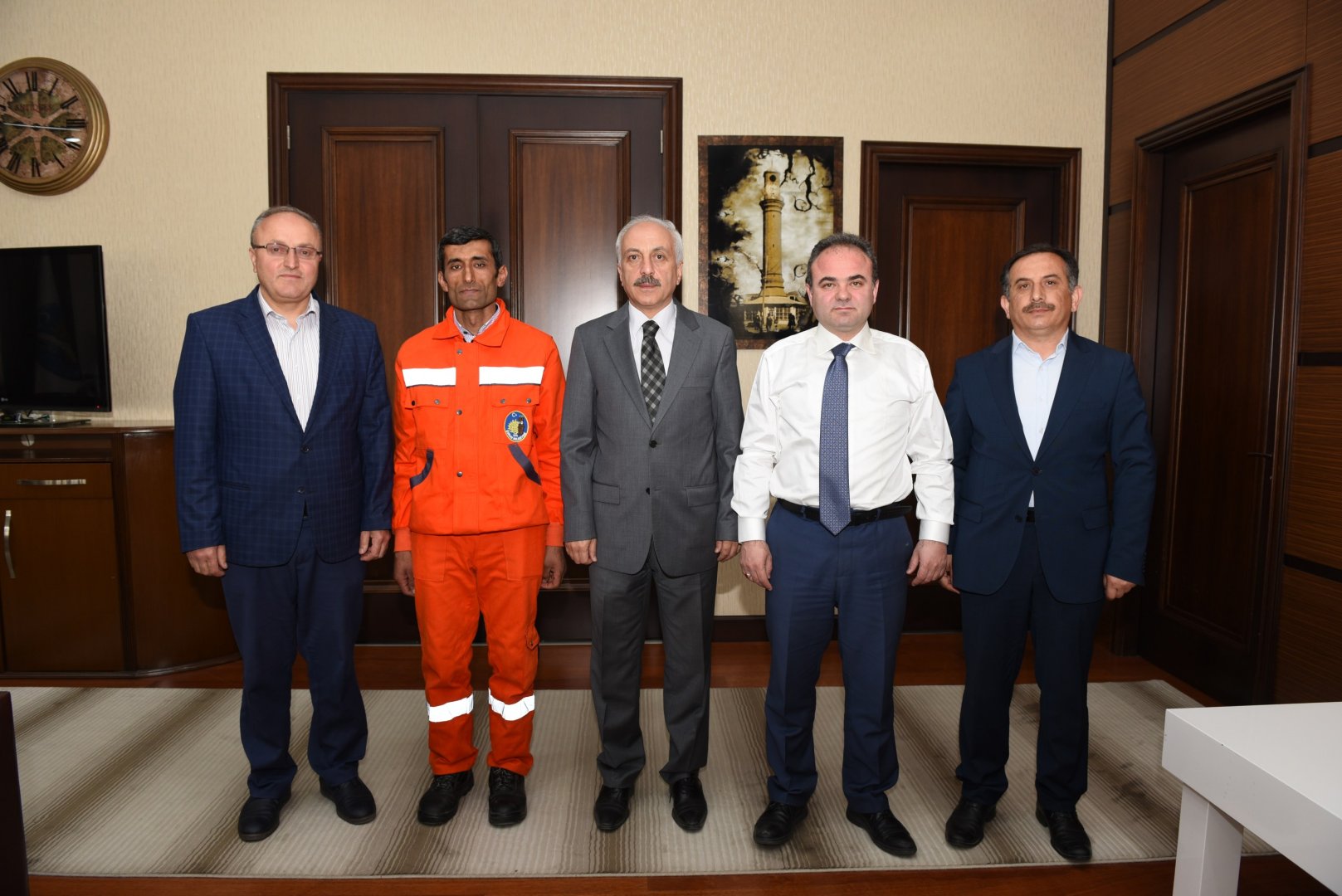 Temizlik İşçisi Eşref Türk, Belediye Başkan Yardımcısı Turhan Candan, Temizlik Amirleri ile Belediye Başkanı Zeki Gül’ü ziyaret etti.