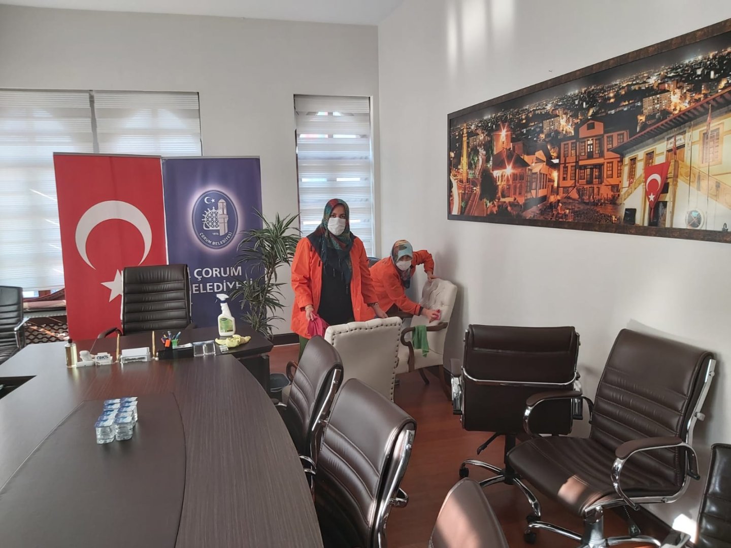 Belediyemiz, düzenli olarak şehir genelinde yürüttüğü temizlik ve dezenfekte çalışmalarını pandemi sonrası arttırdı. Koronavirüs’e karşı yayılmayı önleyici tedbir çalışmaları kapsamında şehir genelinde olduğu gibi, halkın yoğun olarak kullandığı alanlarda temizlik çalışması yapan belediye, virüse karşı tedbirleri artırmaya devam ediyor. Bu kapsamda Çorum Belediyesi hizmet binası içerisinde tüm odalarda temizlik çalışması ve dezenfekte çalışması yapan belediye, halkın yoğun olarak kullandığı koltuk, kapı, numaratör gibi eşyaları detaylı yıkama ile temizlendi. Her zaman halk sağlığını ön plana aldıklarını belirten Belediye Başkanımız Dr. Halil İbrahim Aşgın “Çorum Belediyesi olarak düzenli olarak gerçekleştirdiğimiz dezenfekte ve temizlik çalışmalarımıza her alanda devam ediyoruz. Bu çalışmalarımıza, Korona virüs sonrası çok daha fazla arttırdık. Halkımıza hizmet verdiğimiz belediye hizmet binamızı herhangi bir olumsuz durumun yaşanmaması için önlem amaçlı detaylı bir şekilde temizledik. Hemşehrilerimizin sağlığı her şeyden önemli” dedi.