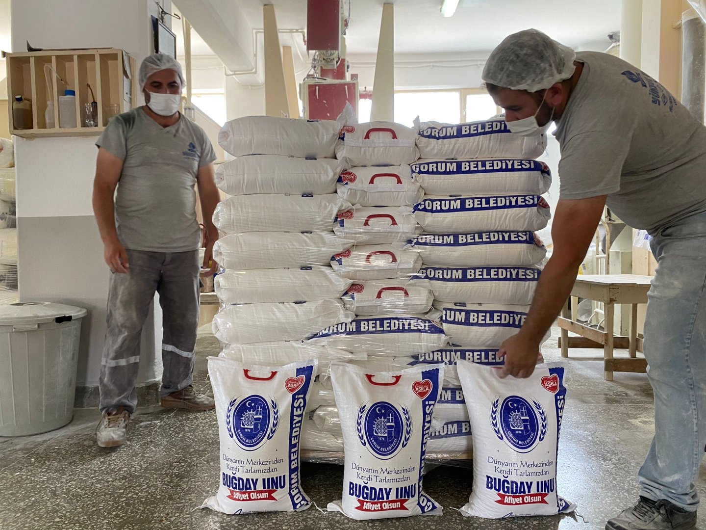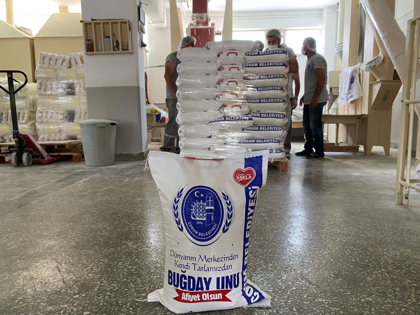 Çorum Belediyesi’nin ürettiği buğdaylar una dönüştü. 10’ar kiloluk­ çuvallar halinde paketlenen toplam 15 ton un,  ihtiyaç sahiplerine dağıtılacak.