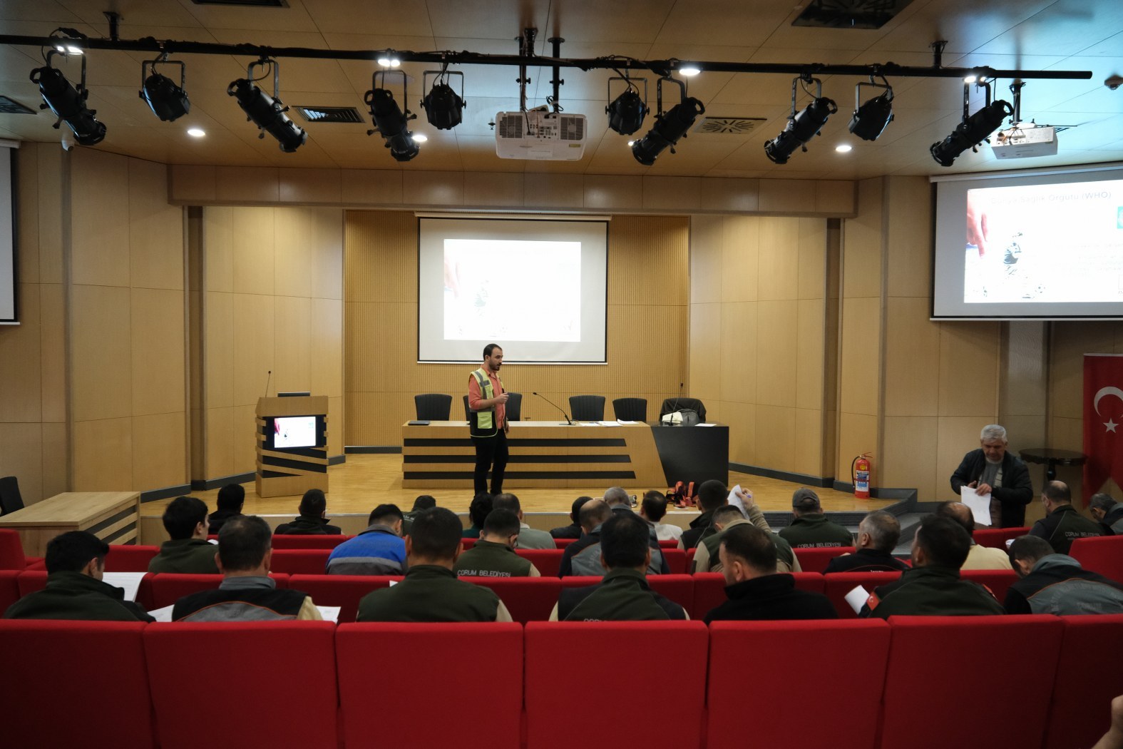Çorum Belediyesi personelin iş sağlığı ve güvenliği ile yüksekte çalışma konularında bilgilendirilmesi amacıyla hizmet içi eğitim çalışmalarını sürdürüyor.