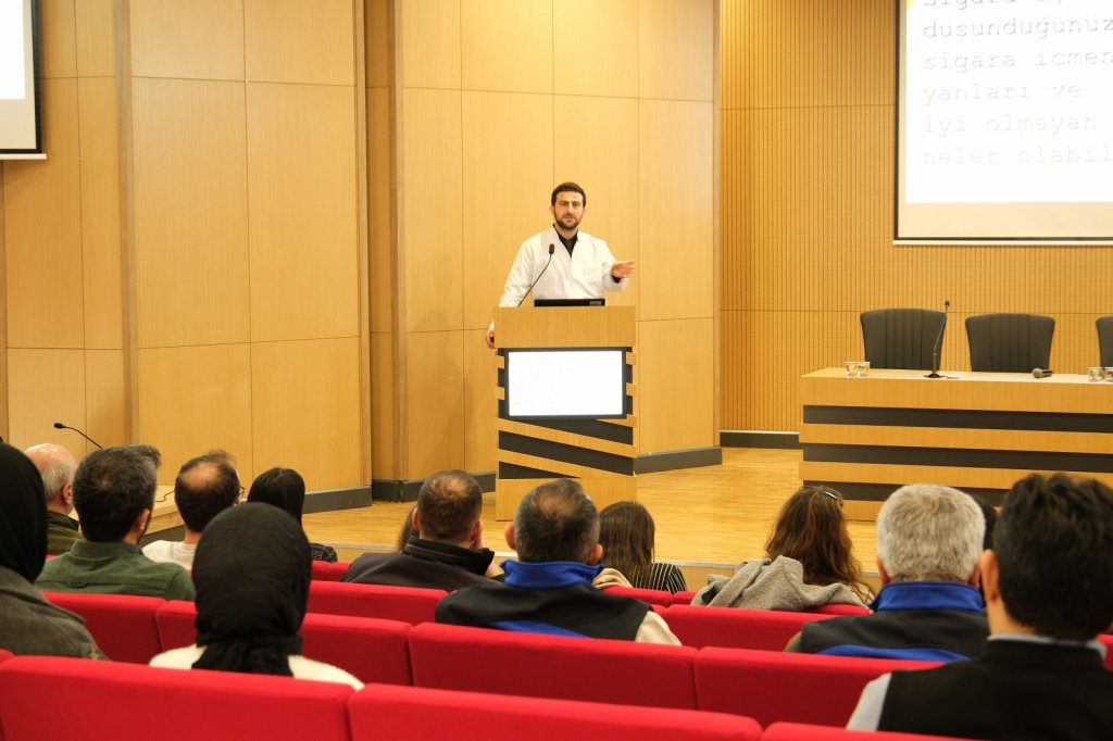Sigaranın zararları hakkında detaylı bilgilerin aktarıldığı sunumda, sigaranın dünya genelinde ve ülkemizde önemli bir halk sağlığı sorunu olduğuna dikkat çekildi. Yüksek oranda nikotin içerdiği için bağımlılık yapma potansiyeline sahip olduğu belirtilirken, sigara, nargile ve pipo kullanımının ya da sigara dumanının solunmasının zamanla psikolojik ve fiziksel bağımlılığa yol açtığı ifade edildi. Ayrıca tütün ürünlerinde 4 binden fazla kimyasal madde bulunduğu ve bunların kansere ve birçok sağlık sorununa neden olduğu anlatıldı.