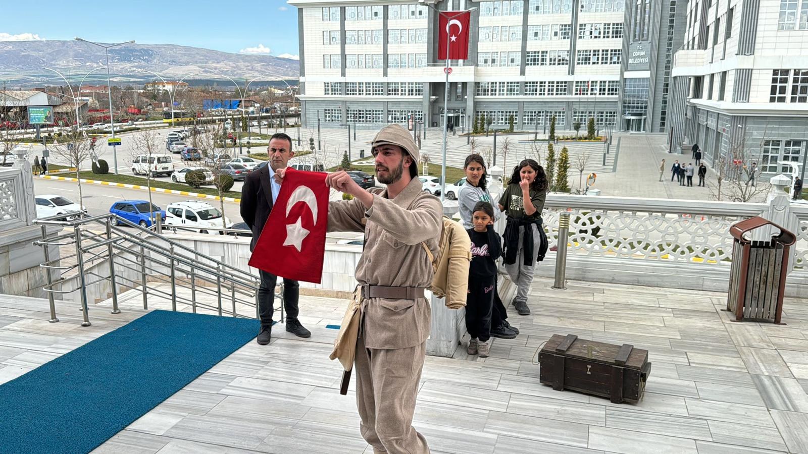 Çorum Belediyesi, 18 Mart Şehitleri Anma Günü ve Çanakkale Deniz Zaferi'nin yıldönümünde, şehitlerimizin anısına etkinlikler gerçekleştirdi. Çanakkale'de yaşananları unutmamak, şehitlerimizin fedakârlığını ve vatanseverlik ruhunu gelecek kuşaklara aktarmak için 18 Mart’a özel hazırlanan gösteriler halka sunuldu.  Kültür ve Sosyal İşler Müdürlüğü tarafından hazırlanan program okullarda ve şehrin farklı noktalarında gerçekleştirildi. Gösteride, Çanakkale zaferinin kazanılmasında ödenen büyük bedeller ve zaferin önemi vurgulandı.