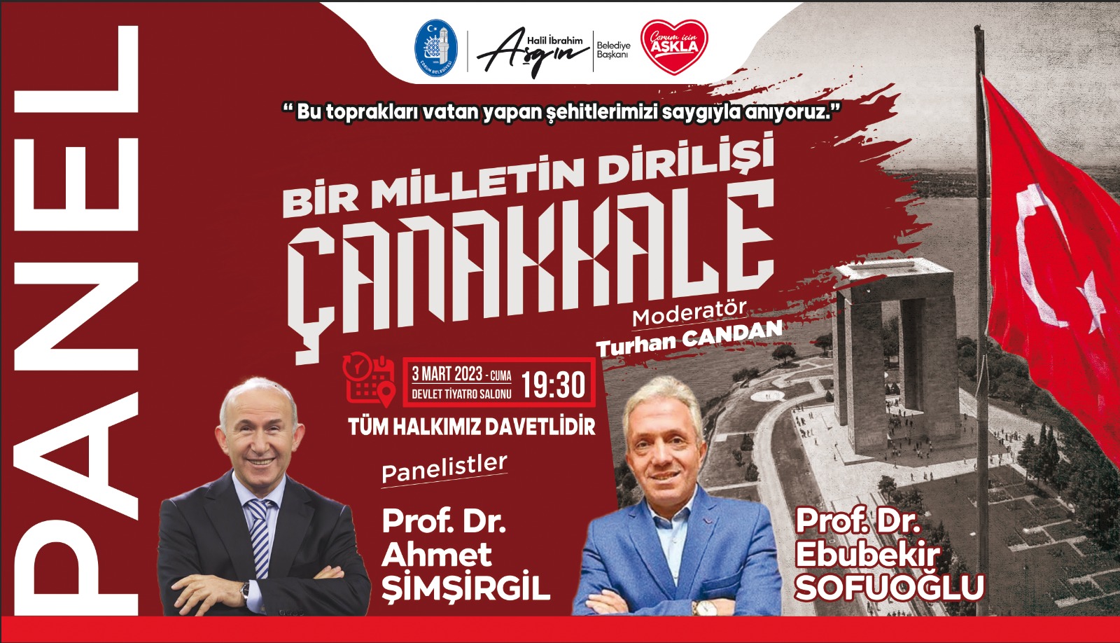 3 Mart Cuma günü saat 19.30’da Devlet Tiyatro Salonu’nda gerçekleştirilecek “Bir Milletin Dirilişi Çanakkale” konulu panel, Çorum Web TV’den de canlı olarak yayınlanacak.