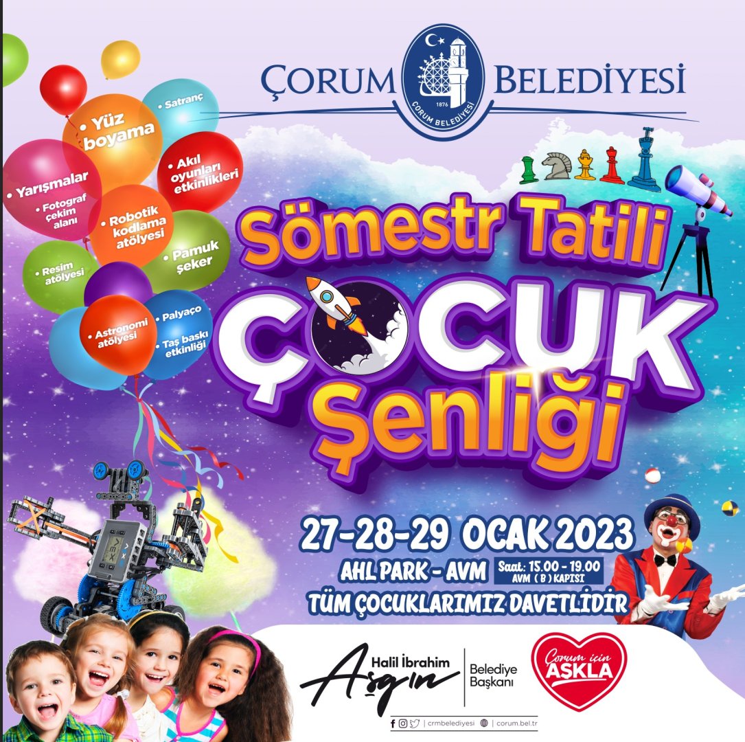 Çorum Belediyesi, sömestr tatiline giren öğrenciler için “Çocuk Şenliği” düzenliyor. Çocukların doyasıya eğleneceği etkinliler 27-28-29 Ocak’ta AHL Park’ta yapılacak.