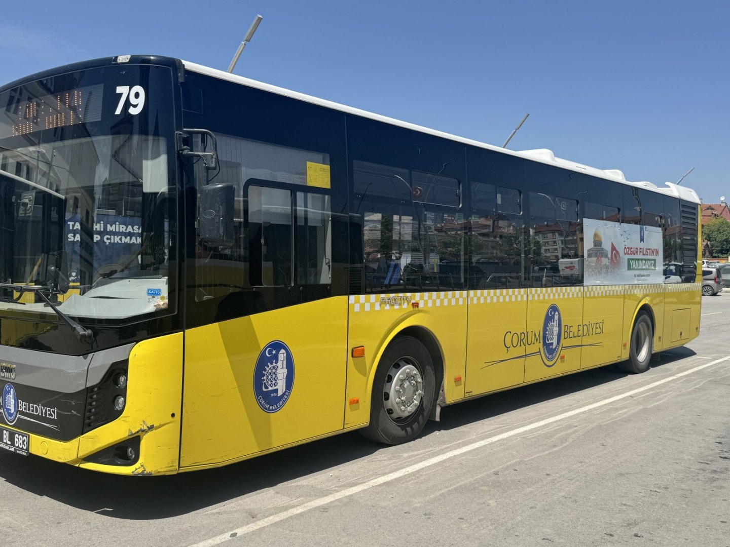 Çorum Belediyesi, Filistin’e destek çağrısını sürdürüyor. Şehrin farklı yerlerindeki billboardlara ve halk otobüslerine Filistin’e destek mesajlarının yazılı olduğu afişler asıldı.