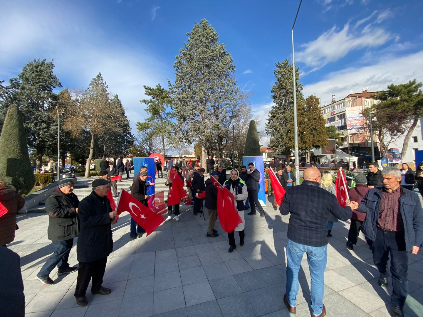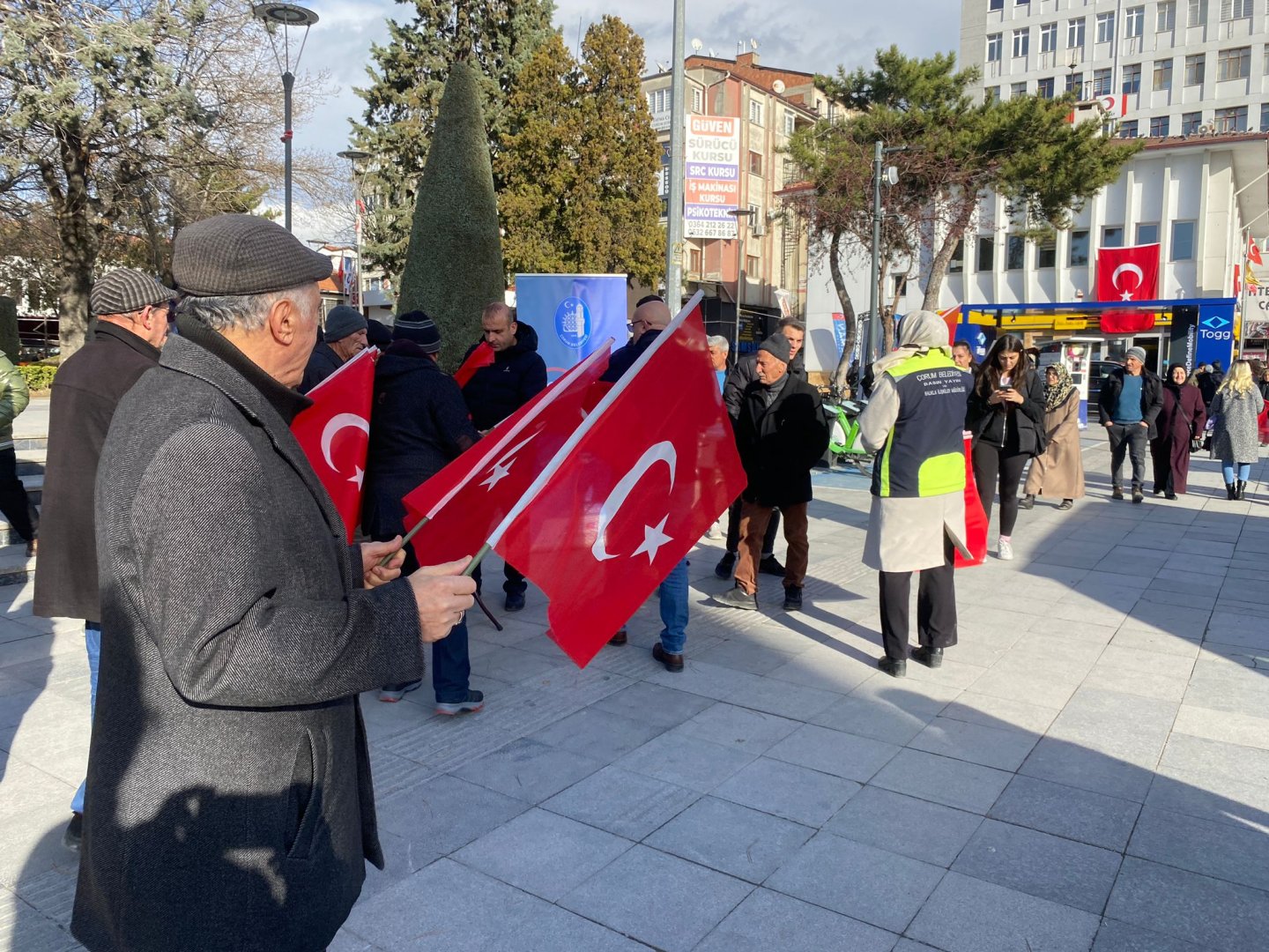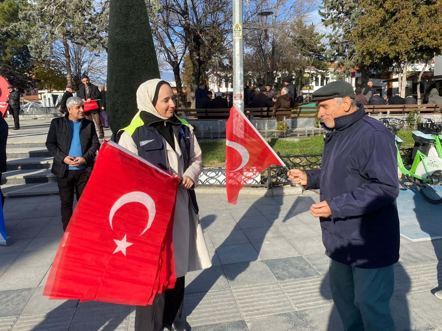 Günün birlik günü olduğunu vurgulayan Belediye Başkanı Dr. Halil İbrahim Aşgın, "Mehmetçiğe moral vermek amacıyla bayrak seferberliği başlattık. Biz büyük ve güçlü bir ülkeyiz. Bu zorlu günler, birbirimize daha da sıkı kenetlendiğimiz günlerdir. Bu kenetlenmenin en büyük simgesi şehit kanlarıyla boyanmış al bayrağımızdır. Biz de bu sebeple hemşehrilerimize şanlı Türk Bayrağımızı hediye ediyoruz." dedi.