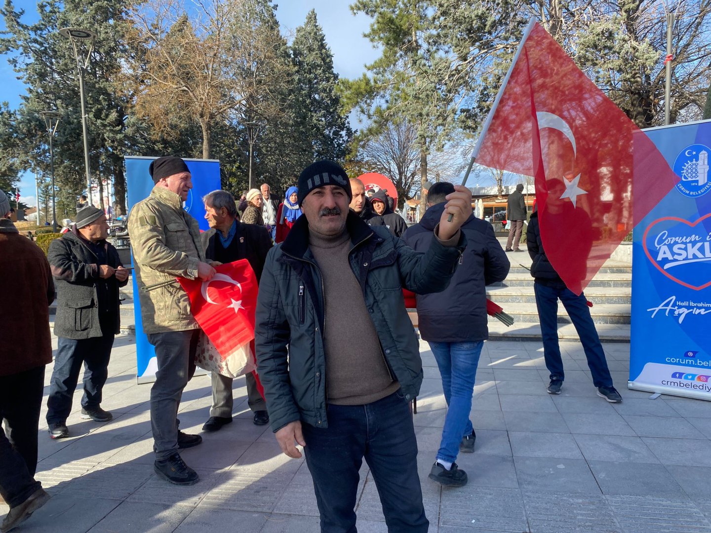 Çorum Belediyesi şehri bayraklarla donatmak için Hürriyet Meydanı’nda vatandaşlarla Türk Bayrağı hediye etti. Bayrak dağıtımına Çorum Şehit Aileleri Derneği, Türkiye Harp Malulü Gaziler Şehit Dul ve Yetimleri Derneği ve Çorum Muharip Gaziler Derneği yöneticileri de katıldı.