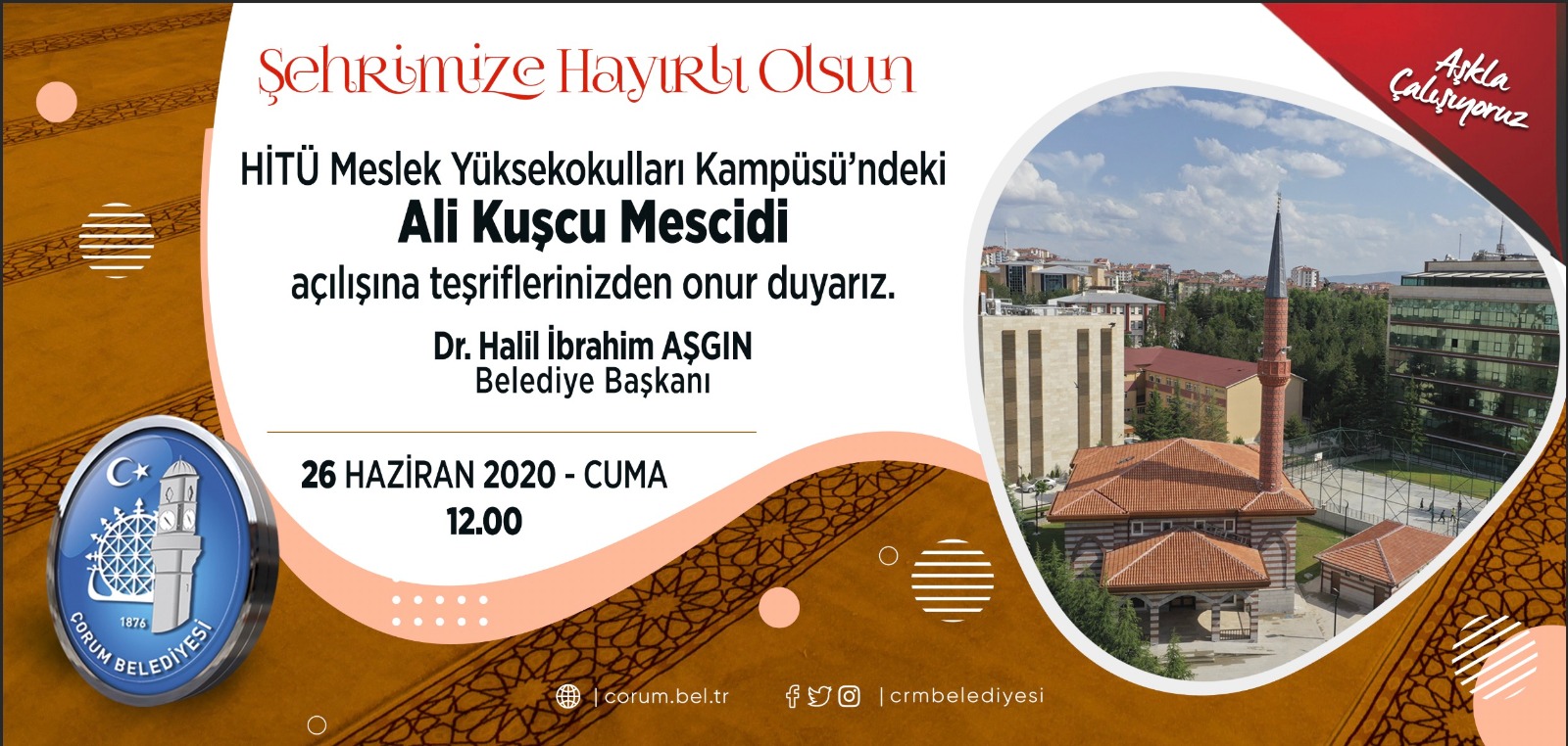Belediyemiz tarafından Hitit Üniversitesi Meslek Yüksek Okulları Kampüsü içerisinde inşa edilen Ali Kuşcu Mescidi ibadete açılıyor. 26 Haziran’da kılınacak Cuma namazı ile birlikte ibadete açılacak olan mescit 500 kişi kapasiteli.