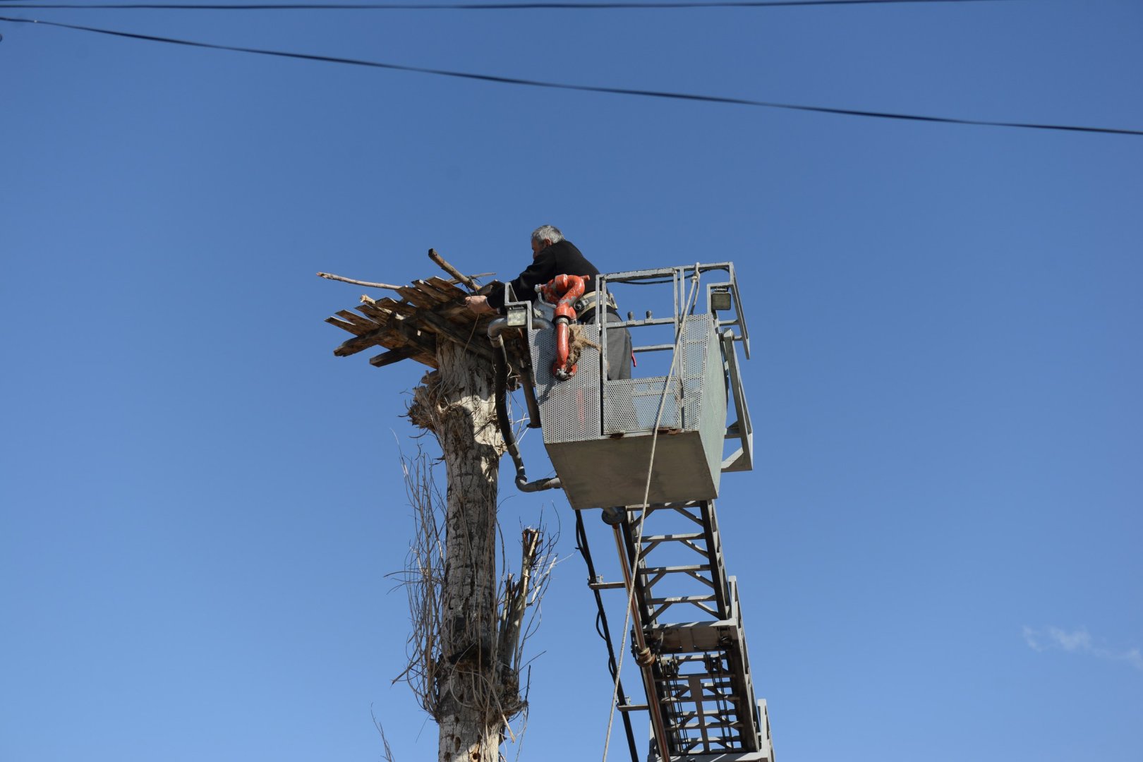 Belediyemiz araç gönderdi, leyleğin yuvasını tamir etti