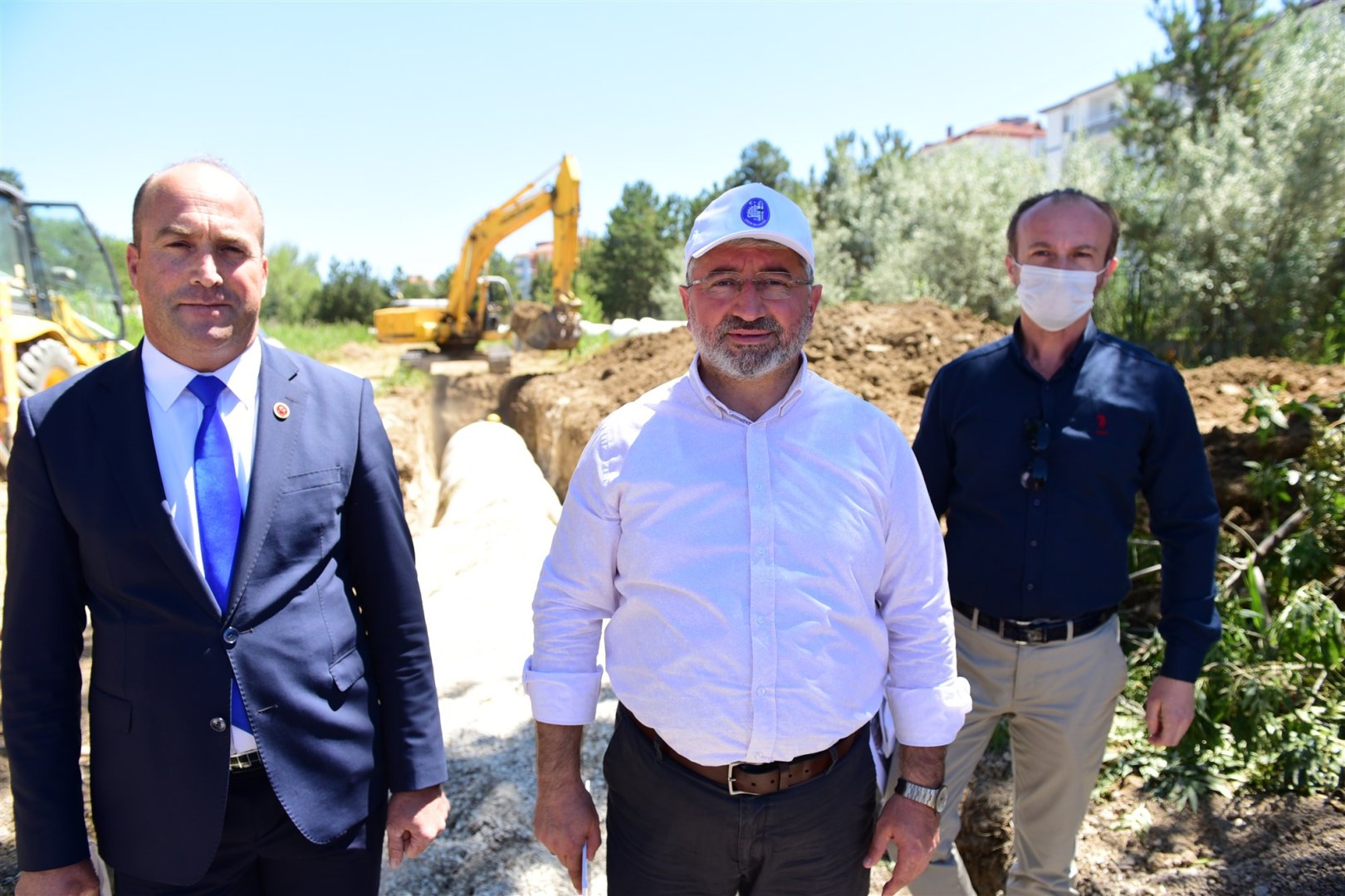 Gülabibey Mahalle Muhtarlığı önünden Sülüklü Deresine kadar olan 650 metrelik kısımda yapılan çalışmaları Gülabibey Mahalle Muhtarı Hasan Belli ile birlikte inceleyen Belediye Başkanımız Dr. Halil İbrahim Aşgın, Su ve Kanalizasyon Müdürü Said Toraman’dan çalışmalarla ilgili bilgiler aldı.