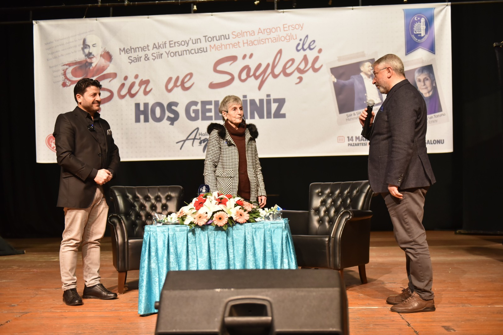 Belediyemiz, İstiklal Marşı’nın kabulünün 101. yıl dönümü ve Mehmet Akif Ersoy’u anma günü nedeniyle şiir ve söyleşi etkinliği programı düzenledi. Programa Mehmet Akif Ersoy’un torunu Selma Argon Ersoy ve şair Mehmet Hacıismailoğlu konuşmacı olarak katıldı.