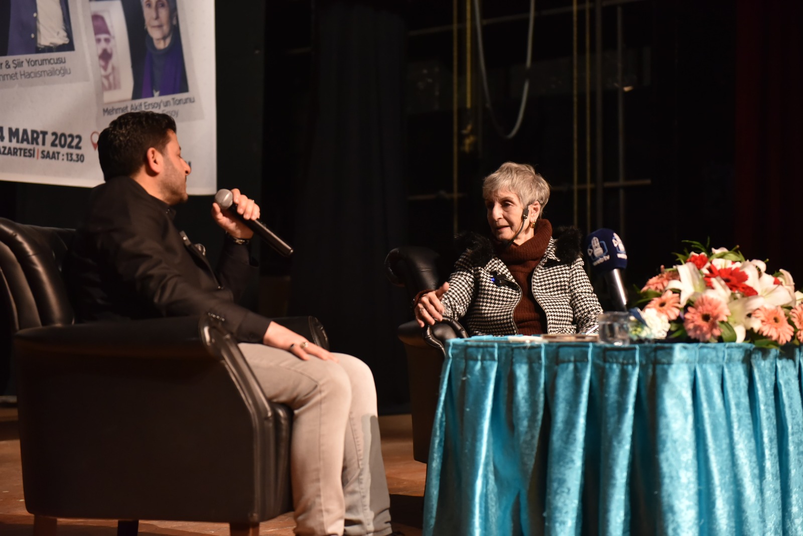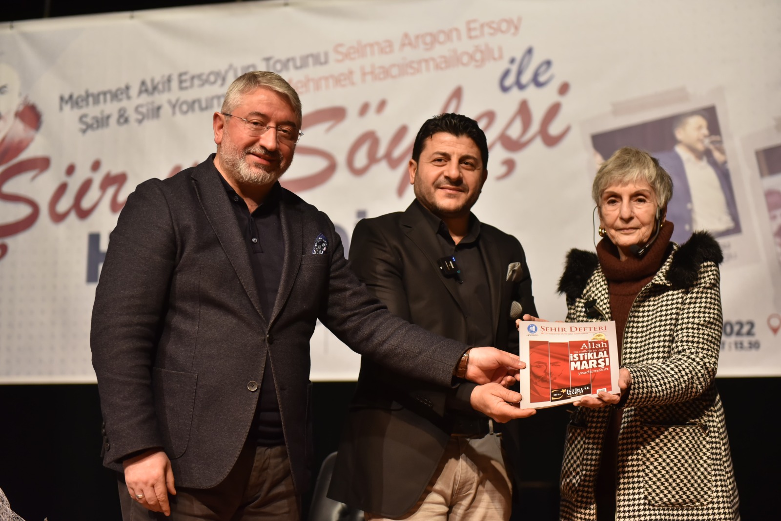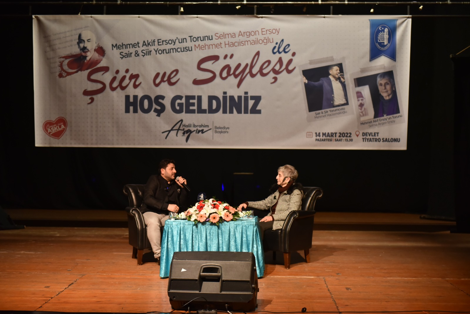 Şair Mehmet Hacıismailoğlu’nun seslendirdiği şiirlerle başlayan programda daha sonra Milli Şair Mehmet Akif Ersoy’un torunu Selma Argon Ersoy, dedesinin yaşamına ve anılarına ilişkin bilgiler aktararak, İstiklal Marşı’nın yazım sürecinde yaşananları anlattı. Ersoy, “Dedem, hayatını milletine adamış dava adamıdır. Söz verdiği zaman, ancak ölürsem bu sözü tutamam dediği biliniyor. Bir gün olsun verdiği sözden dönmemiş bir insandır.” dedi.