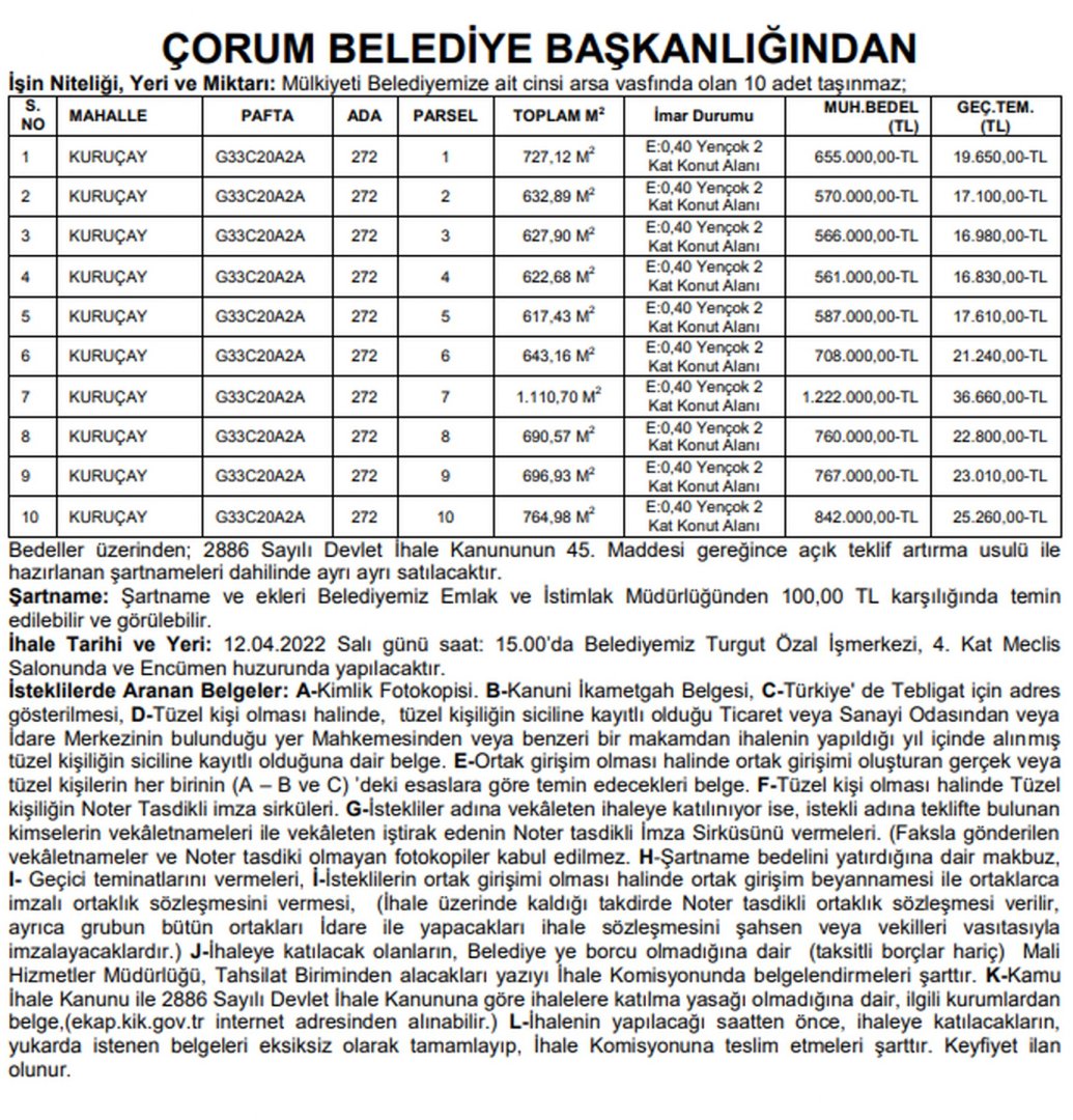 https://ihale.corum.bel.tr/ihale/10-adet-arsa-satisi-ihalesi adreslerinden ulaşılabilirsiniz.