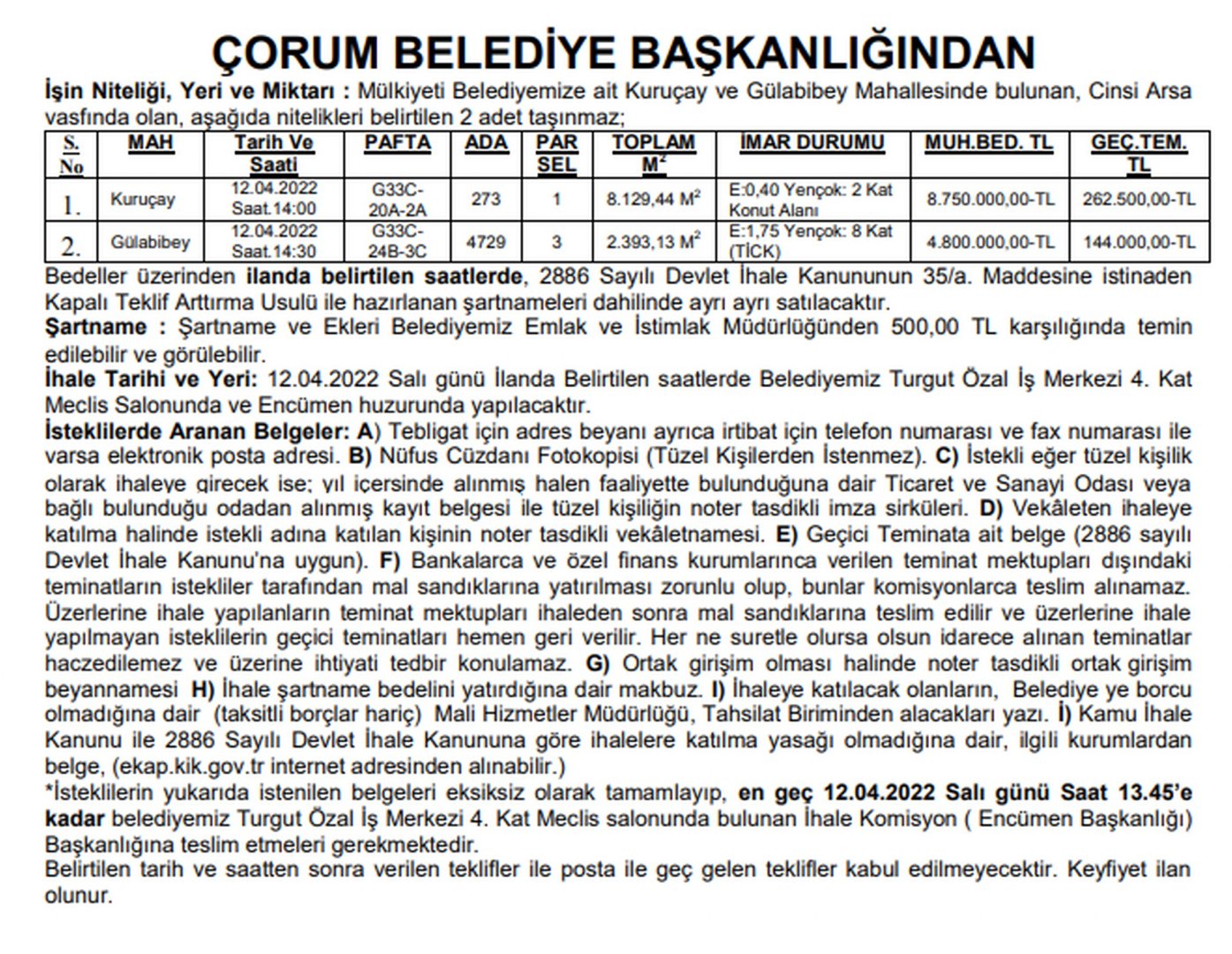 “Mülkiyeti Belediyemize ait Gülabibey Mahallesi’ndeki 8 katlı ticaret, konut ile Silmkent Bölgesindeki villa ve konut arsaları 2886 Sayılı Devlet İhale Kanununa göre ihale yoluyla satılacaktır.”  Yapılacak ihalelerin 12 Nisan Salı günü saat: 14.00,14.30 ve 15.00’da Turgut Özal İş Merkezi Kat: 4 Çorum Belediyesi Meclis Salonunda gerçekleştirilecek ihaleye ait bilgilere https://ihale.corum.bel.tr/ihale/kurucay-ve-gulabibey-mahallesinde-bulunan-2-adet-arsa-satis-ihalesi