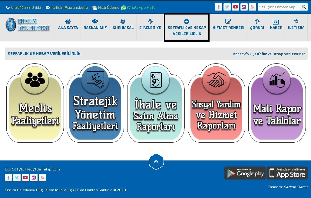 Şeffaf ve hesap verebilir olmak adına yeni bir uygulama başlatan belediyemiz, mali tablo ve raporları, ihale ve satın alma raporlarını, sosyal yardım ve hizmet raporlarını, performans planını, stratejik yönetim faaliyetlerini ve meclis kararlarını belediyemizin resmi internet sitesindeki www.corum.bel.tr web adresinden yayınlıyor.
