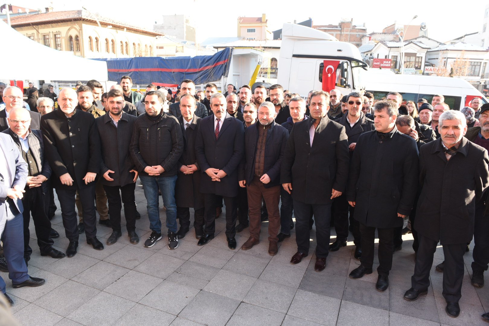 Konuşmaların ardından İl Müftüsü Muharrem Biçer tarafından yapılan duanın ardından içerisinde yağ, şeker, un, baklagil gibi temel yiyecek malzemelerinin bulunduğu 1040 paket gıda kolisinin yanı sıra 1900 parça battaniye, kaban, mont, ayakkabı gibi giyecek eşyalarının bulunduğu 3 Tır ve 1 minibüs deprem bölgesine uğurlandı.
