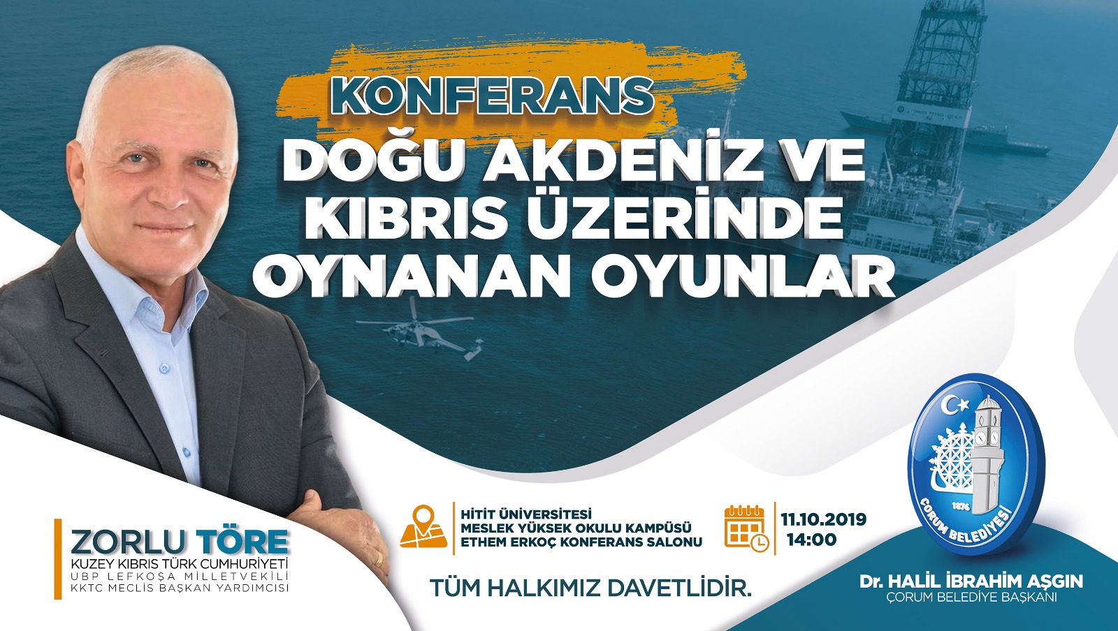 Çorum Belediyesi tarafından “Kıbrıs Üzerinde Oynanan Oyunlar” adlı konferans düzenlenecek. Konferansta Kuzey Kıbrıs Türk Cumhuriyeti USB Lefkoşa Milletvekili ve Meclis Başkan Yardımcısı Zorlu Töre konuşmacı olarak yer alacak.