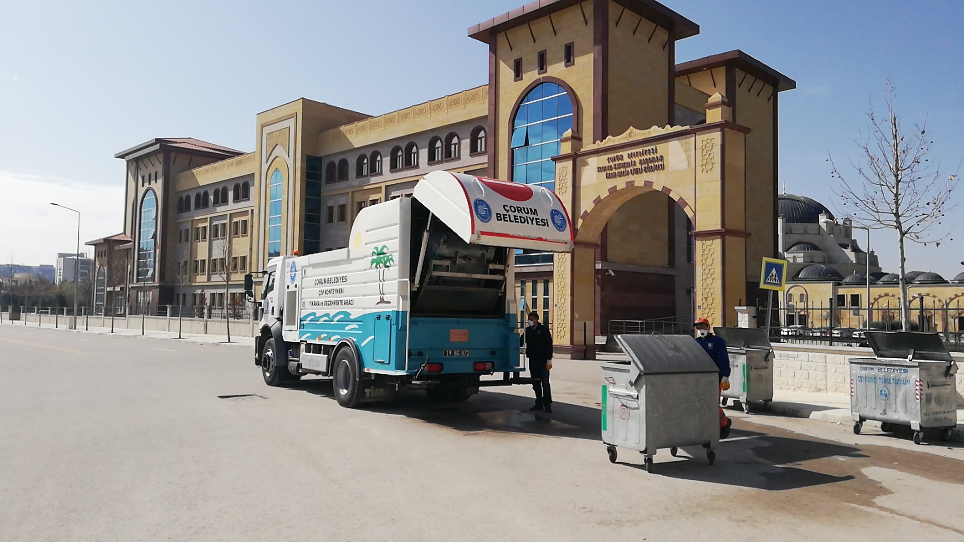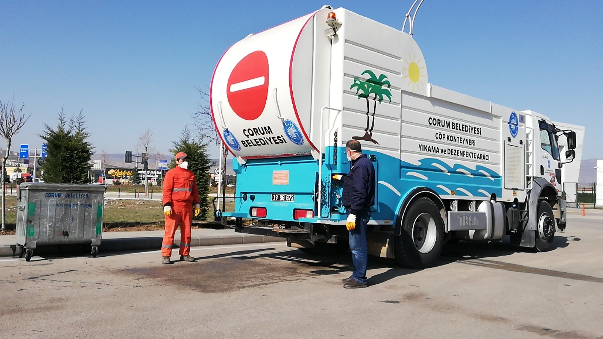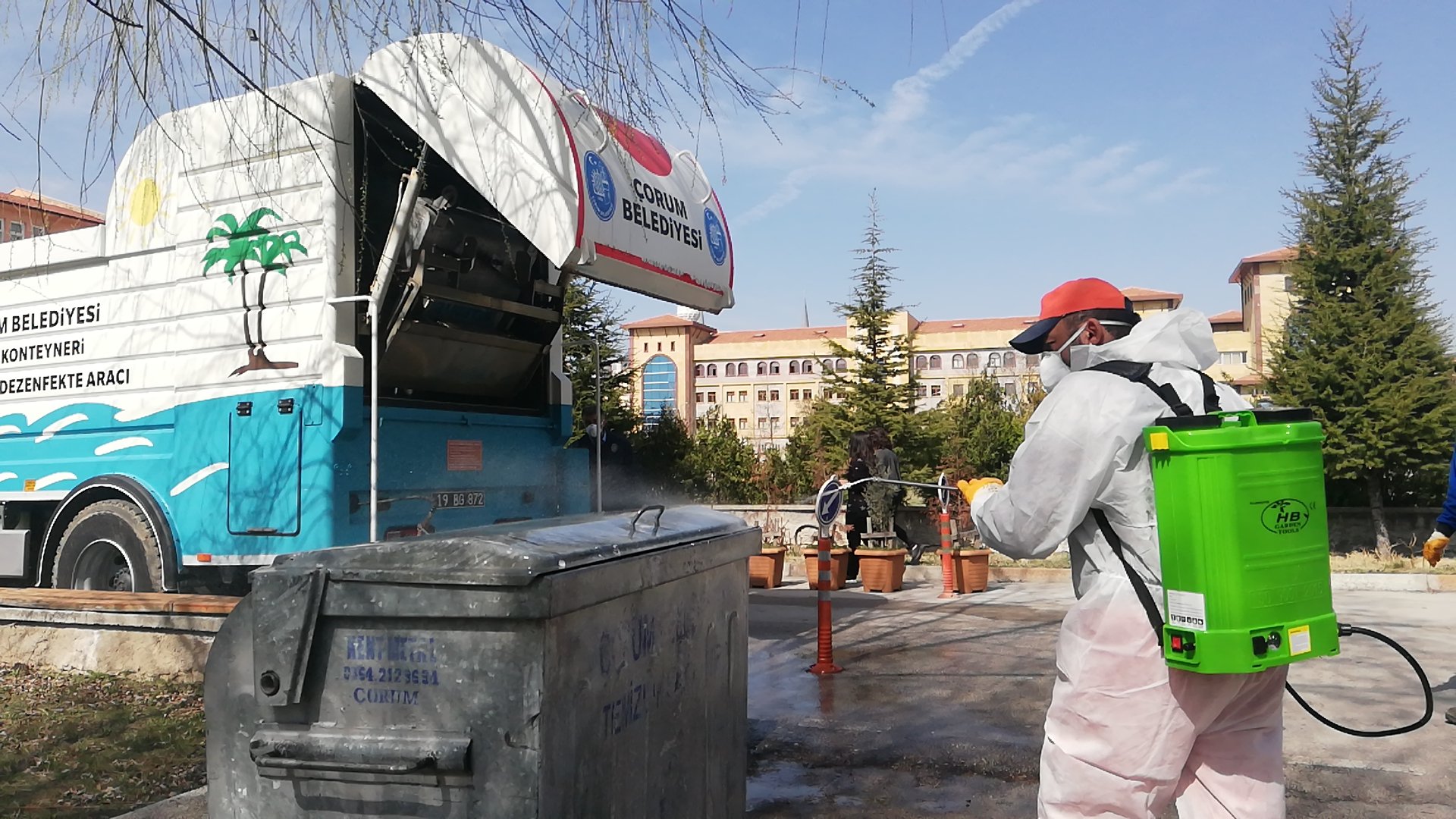 Çorum Belediyesi, korona virüse karşı önlem amacıyla çalışmalarına tüm hızıyla devam ediyor. Dezenfekte çalışmaları kapsamında vatandaşın yoğun olarak bulunduğu otobüs durakları, toplu ulaşım araçları, şehirler arası otobüs terminali, konteynırlar, camiler, okullar, çocuk oyun alanları, park ve yeşil alanlarda çalışmalar yoğun bir şekilde devam ediyor.