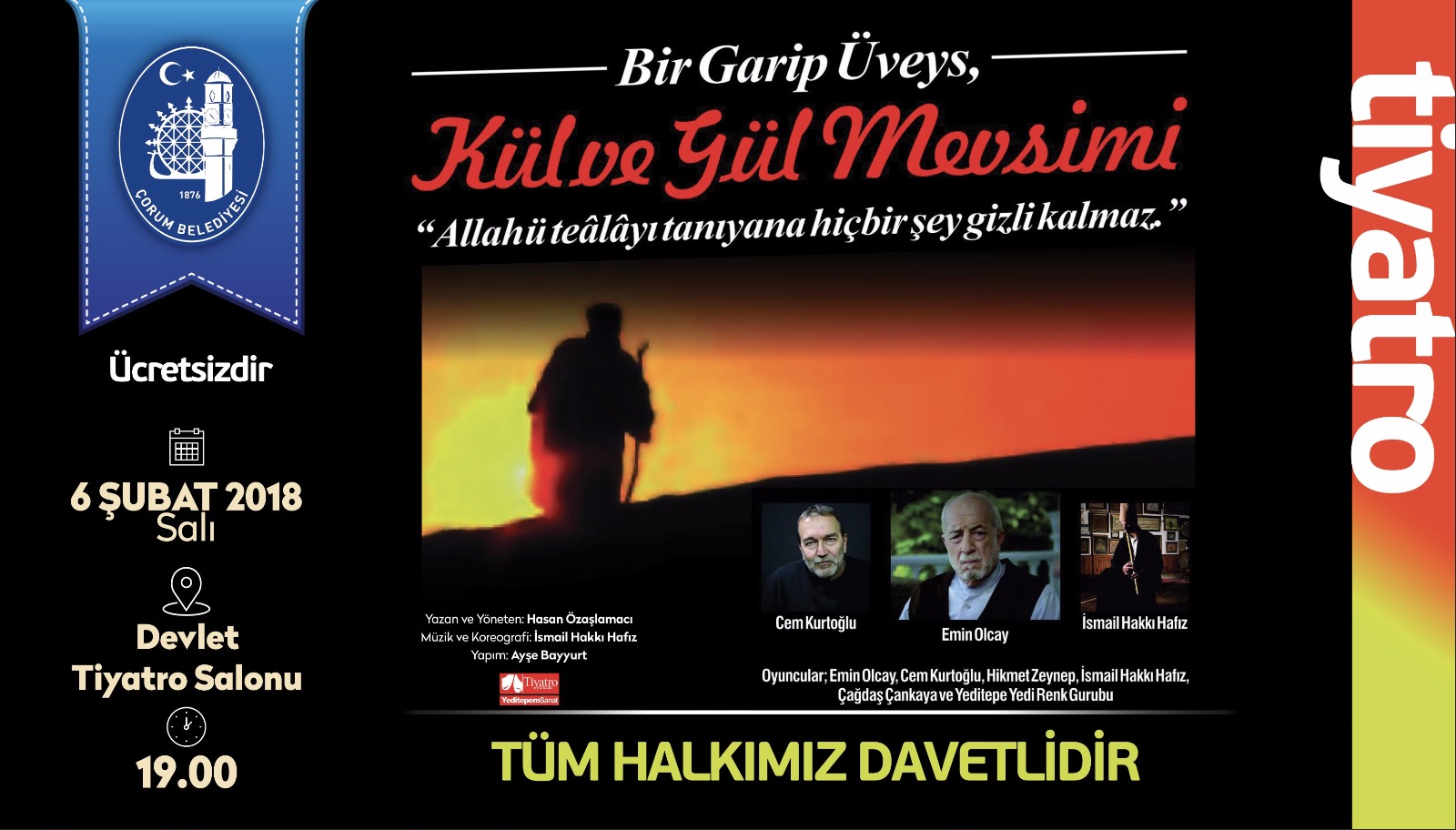 Çorum Belediyesi Kültür ve Sosyal İşler Müdürlüğü tarafından organize edilen “Bir Garip Üveys, Kül ve Gül Mevsimi” adlı tiyatro oyunu 6 Şubat Salı günü Devlet Tiyatro Salonunda saat 19.00’da Çorumlu sanatseverlerle buluşacak.