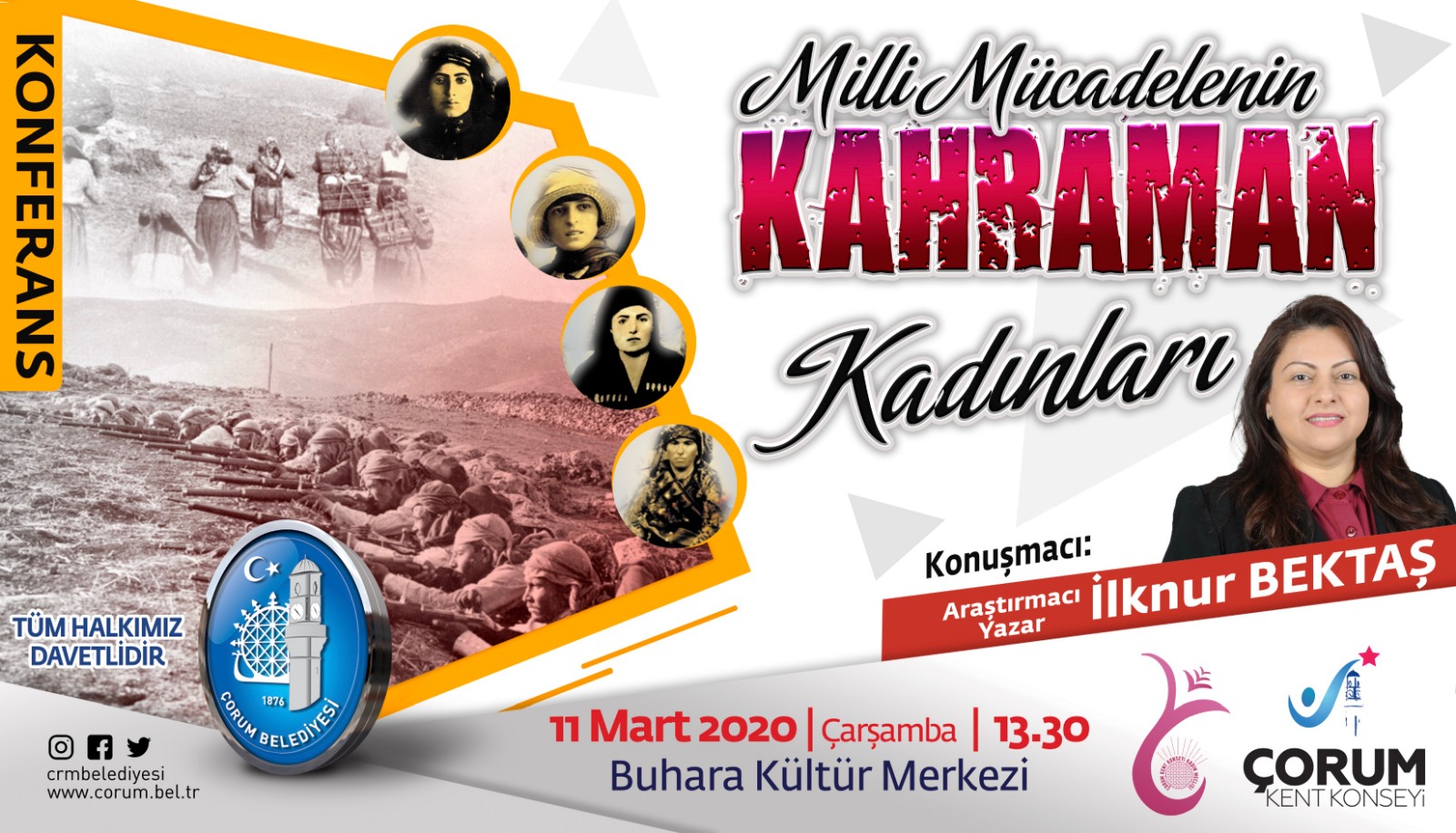 8 Mart Dünya Kadınlar Günü nedeniyle düzenledikleri konferansta Milli Mücadele döneminde, vatanı için gözünü kırpmadan savaşan kadın kahramanların anlatılacağını söyleyen Belediye Başkan Yardımcımız İsmail Yağbat, “Savaş döneminde cephede vatanı için düşmanla çarpışan askerlere yaptıkları fedakârlıklarla tarihe adlarını altın harflerle yazdıran kadınların öykülerinin anlatılacağı konferansımıza tüm Çorum halkını davet ediyoruz” dedi.