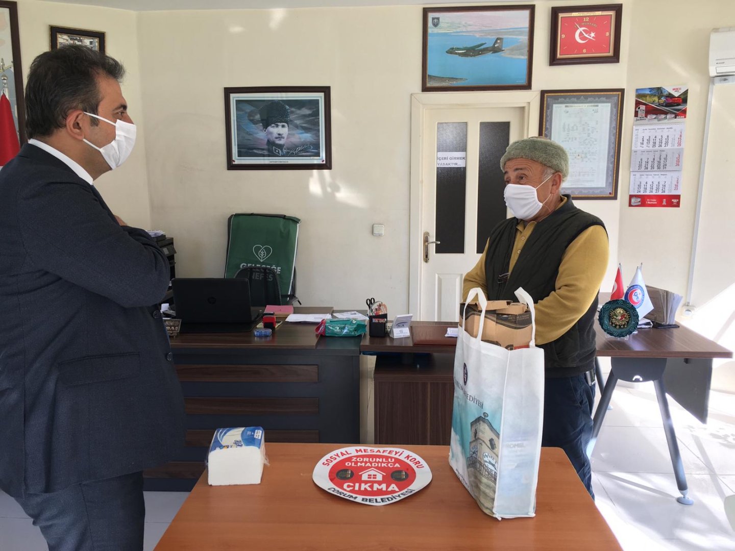 Merkez mahalle muhtarları, kendilerine daha sağlıklı bir çalışma ortamı oluşturmak amacıyla eldiven, maske ve dezenfektandan oluşan hijyen setleri için Çorum Belediyesi’ne teşekkür etti. Yaşanan yoğunluklar nedeniyle muhtarlıkların risk taşıdığını ve bu nedenle Çorum Belediyesinin kendilerini düşünerek hijyen seti hazırladığını ifade eden muhtarlar, “Sayın Belediye Başkanımıza hijyen setleri nedeniyle teşekkür ediyoruz. İlk andan beri koronavirüs tedbirleri kapsamında belediyemiz büyük bir gayretle çalışıyor.” dedi.