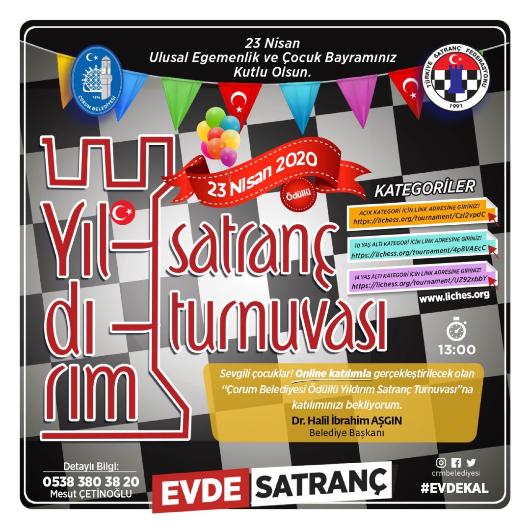 3 kategoride gerçekleşecek olan Çorum Belediyesi 23 Nisan Ulusal Egemenlik ve Çocuk Bayramı Yıldırım Satranç turnuvasının internet üzerinden yapılacağını ifade eden Belediye Başkanımız Dr. Halil İbrahim Aşgın, Türkiye’nin her yerinden çocukların yarışmaya bir tıkla katılabileceklerini dile getirdi. 10 yaş altı, 14 yaş altı ve açık turnuva olarak gerçekleştirecekleri turnuvaya tüm çocukların katılımını dileyen Başkan Aşgın, “Çorum sevginin kardeşliğin sporun ve aynı zamanda satranç sporunun da merkezi. Yeryüzündeki tüm çocukların bayramı olan 23 Nisan’da yine yeryüzündeki tüm çocuklar mutlu olsunlar, gülsünler istiyoruz. Satranç turnuvamız sonunda dereceye giren evlatlarımızın ödüllerini kargo ile evlerine kadar ulaştıracağız. Dereceye giren ilk 4 kişiye madalya, ilk 10 kişiye ise sürpriz ödüllerimiz olacak” dedi.