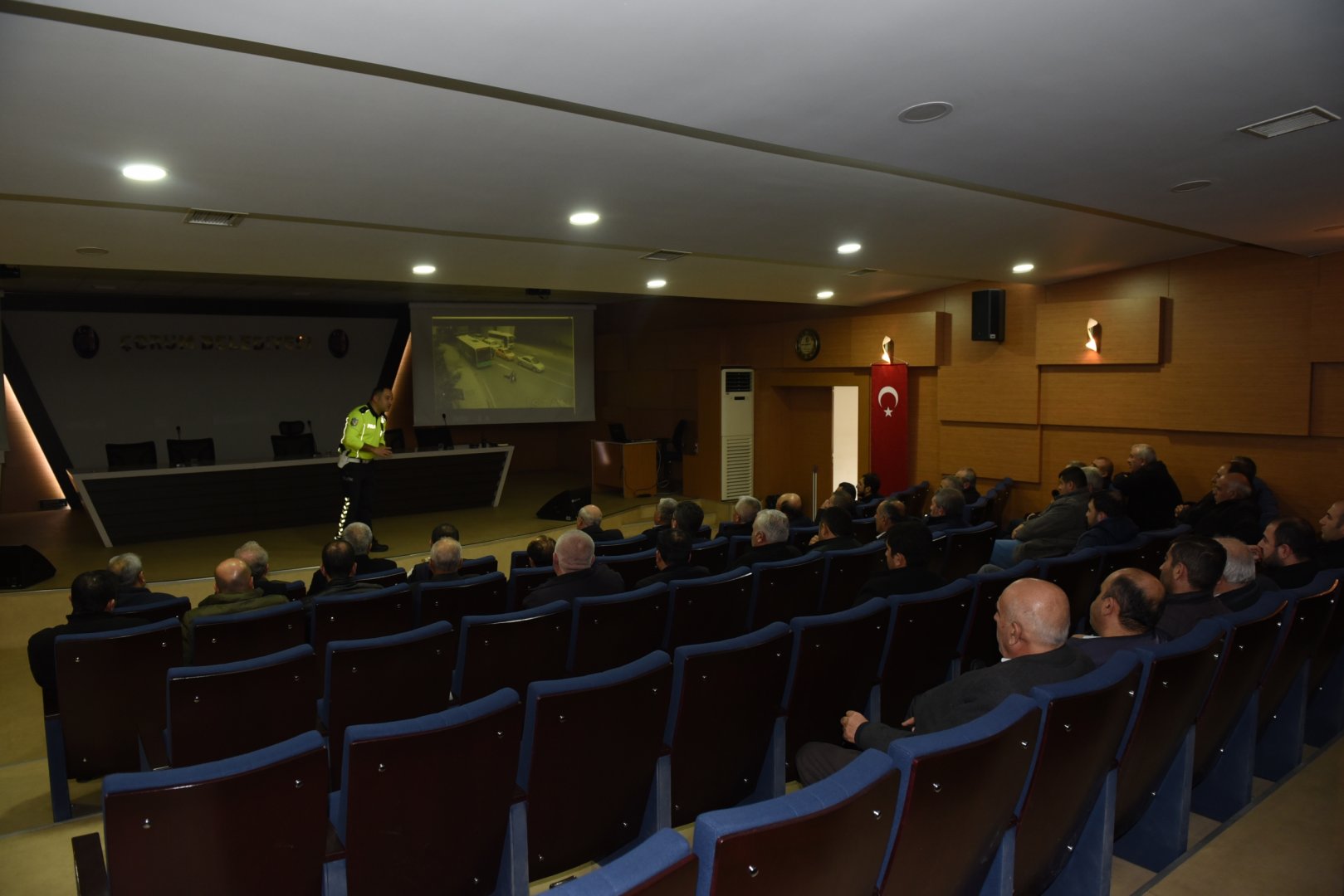 İl Emniyet Müdürlüğü Trafik Şube Müdürlüğünden komiser Bünyamin Demir, farklı yer ve zamanlarda trafik kazalarından oluşan video görüntülerini şoförlere izletilerek alınması gereken dersler konusunda uyarılarda bulunuldu.