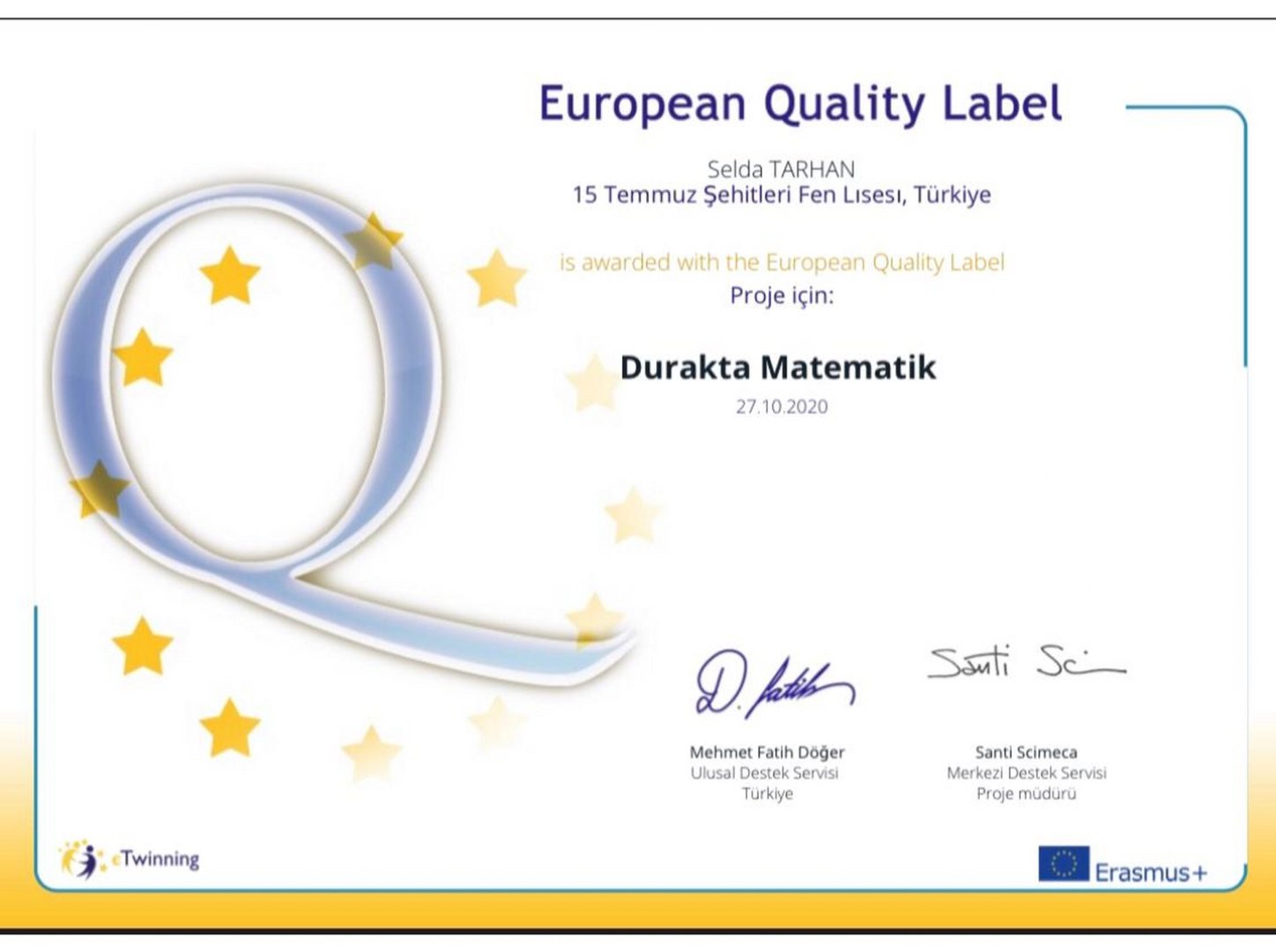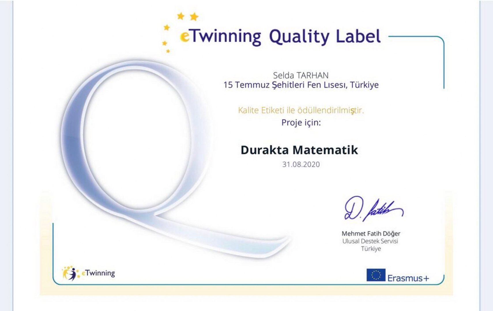 Projenin büyük ilgi gördüğünü sözlerine ekleyen Belediye Başkanımız Dr. Halil İbrahim Aşgın, “Durakta Matematik Projemiz, Ulusal Kalite Etiketi Ödülünün ardından Avrupa Kalite Etiketi Ödülüne de layık görüldü” diye konuştu.