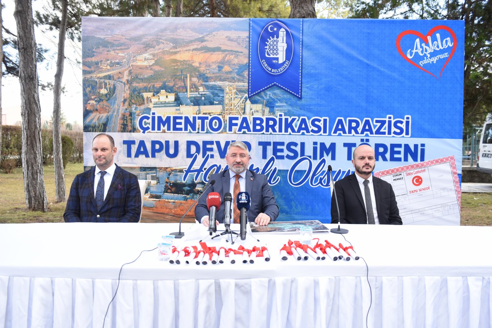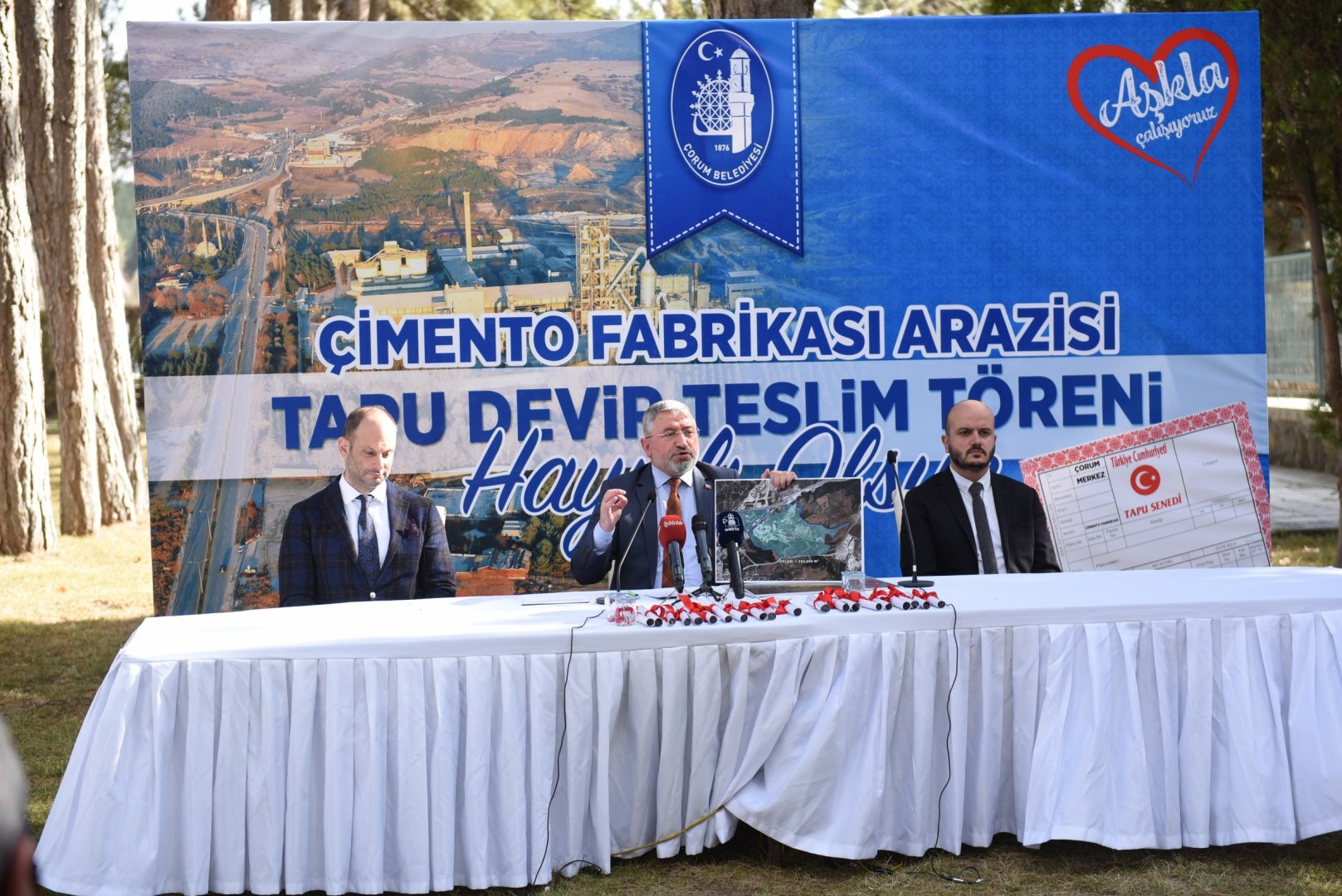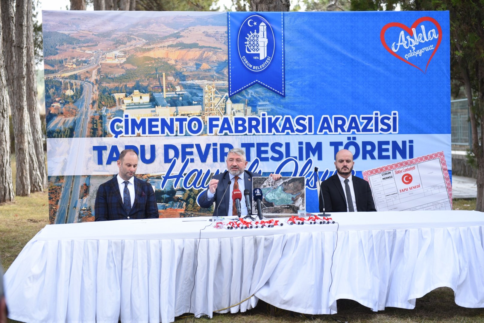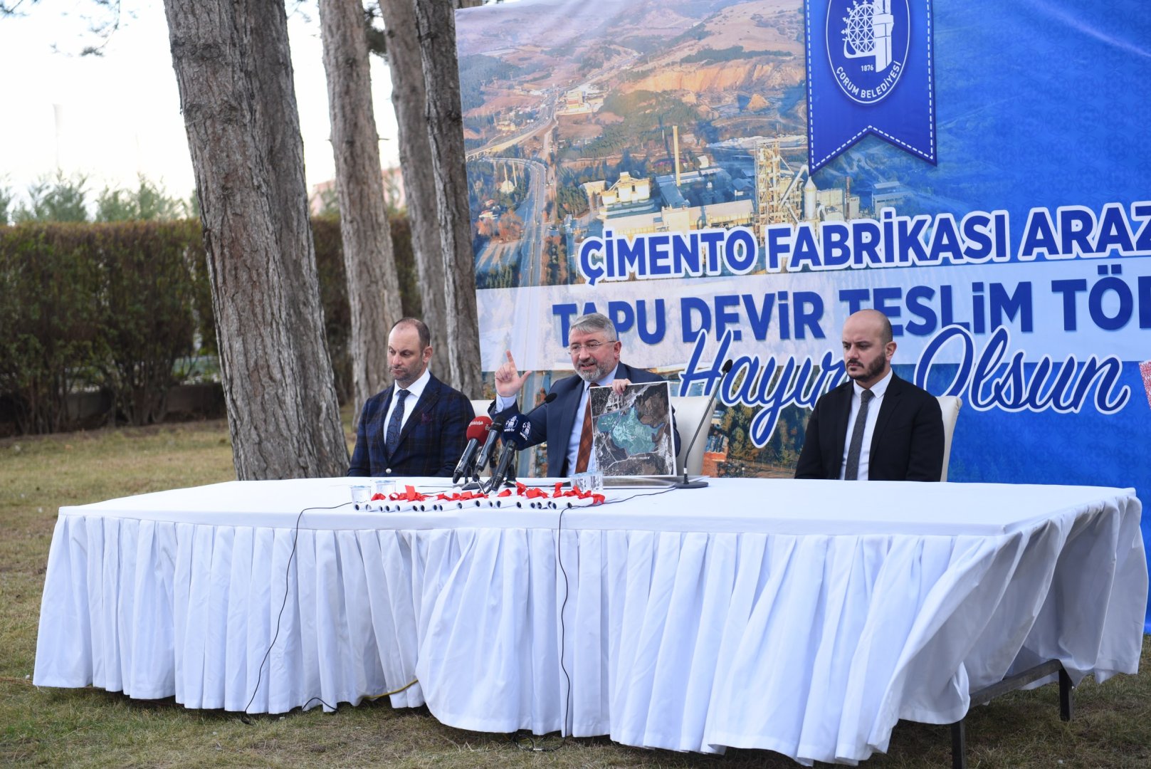 Votorantim Çimento Türkiye Hukuk Müşaviri Alper Erdem ise Belediye Başkanı Dr. Halil İbrahim Aşgın ile yöneticiler ve personele sürecin en başından beri gösterdikleri yapıcı ve profesyonel yaklaşımdan dolayı teşekkür ederek Çorum halkına hayırlı olması temennisinden dulundu. Tören Votorantim Çimento Türkiye Hukuk Müşaviri Alper Erdem’in Belediye Başkanı Dr. Halil İbrahim Aşgın’a tapuları teslim etmesi ile sona erdi. Törenin ardından katılımcılar satın alınan arazileri gezdiler.