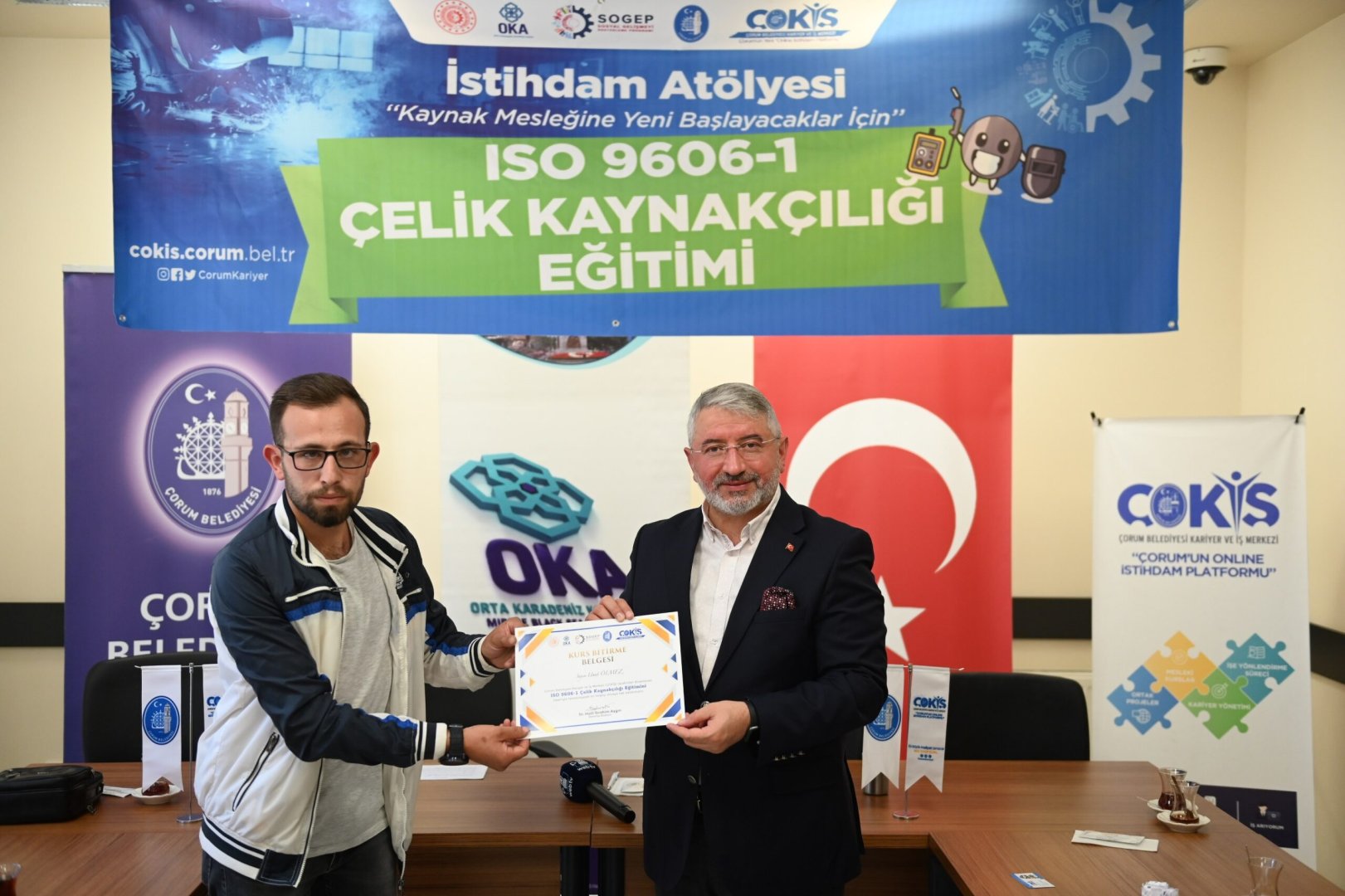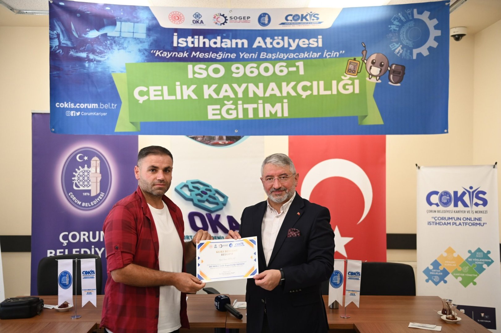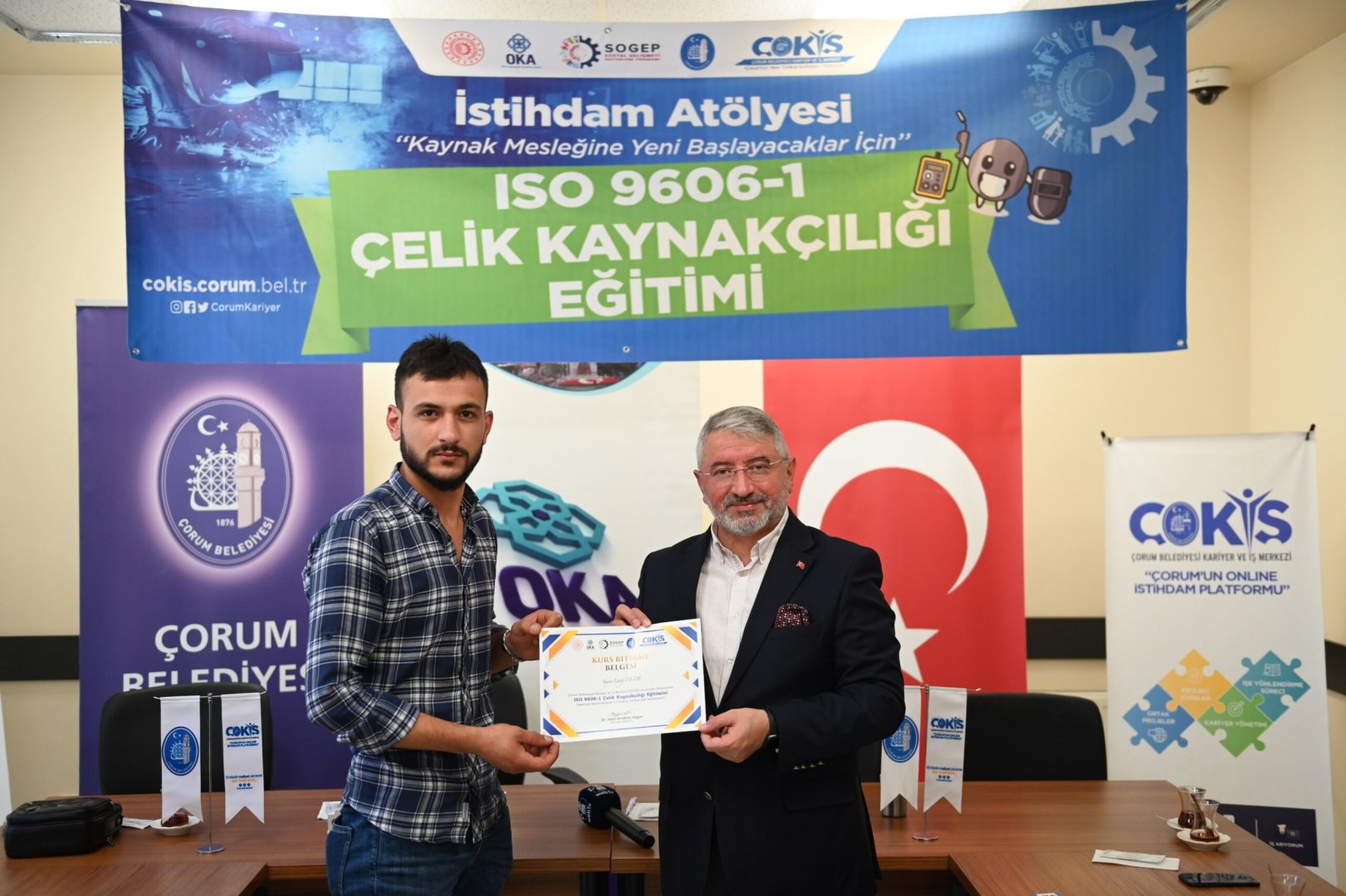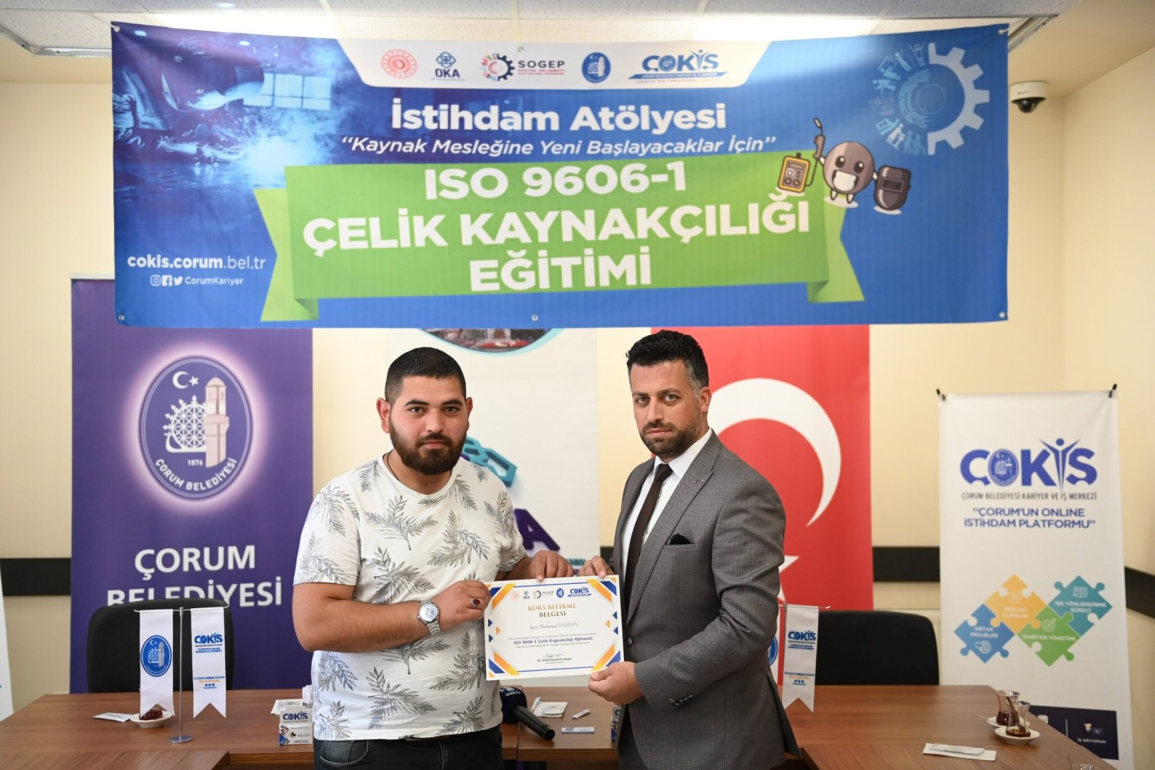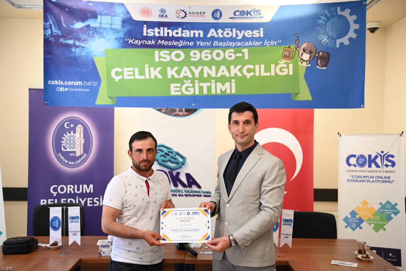 Çorum sanayinin kalifiye eleman ihtiyacı İstihdam Atölyesi ile gideriliyor. İşverenle iş arayanları buluşturarak istihdama büyük katkı sağlayan ÇOKİŞ, kalifiye elemanları sektöre hazırlıyor. İstihdam Atölyesinde, teorik ve uygulama eğitimlerini tamamlayarak sertifika almaya hak kazanan çelik kaynakçılık kursiyerleri, Belediye Başkanımız Dr. Halil İbrahim Aşgın’ında katıldığı törenle sertifikalarına kavuştu.