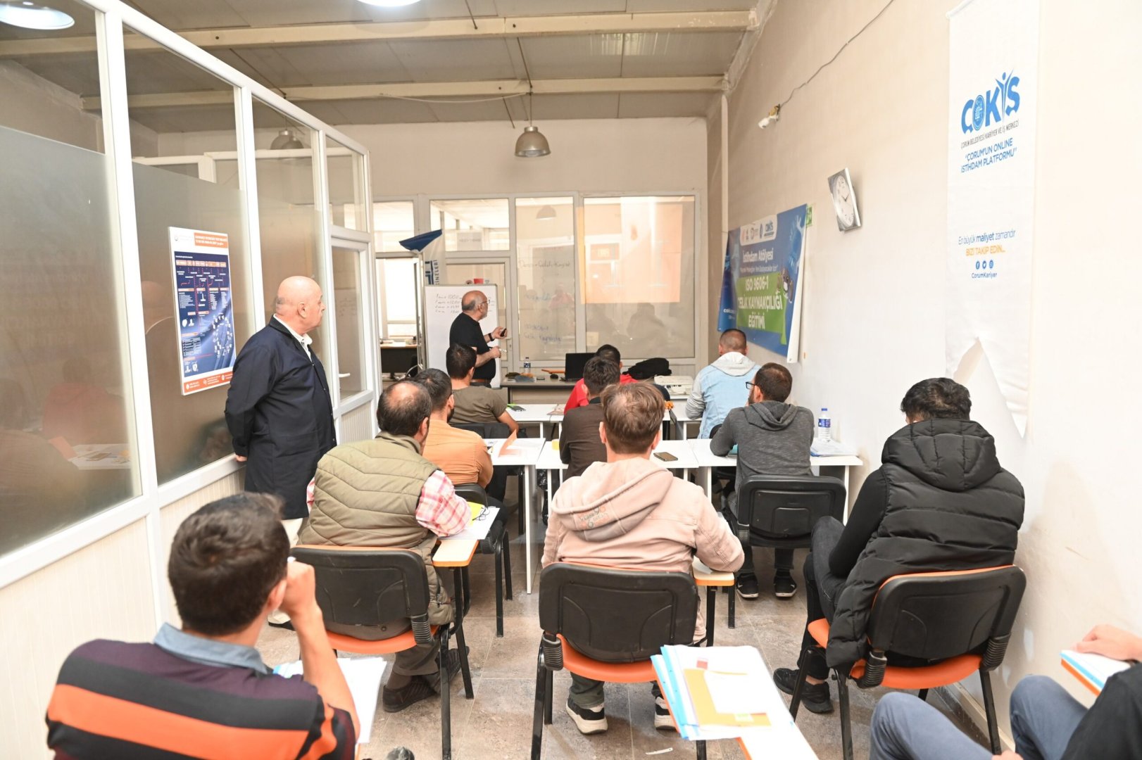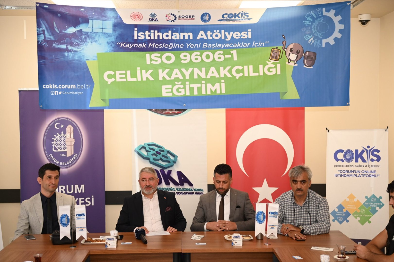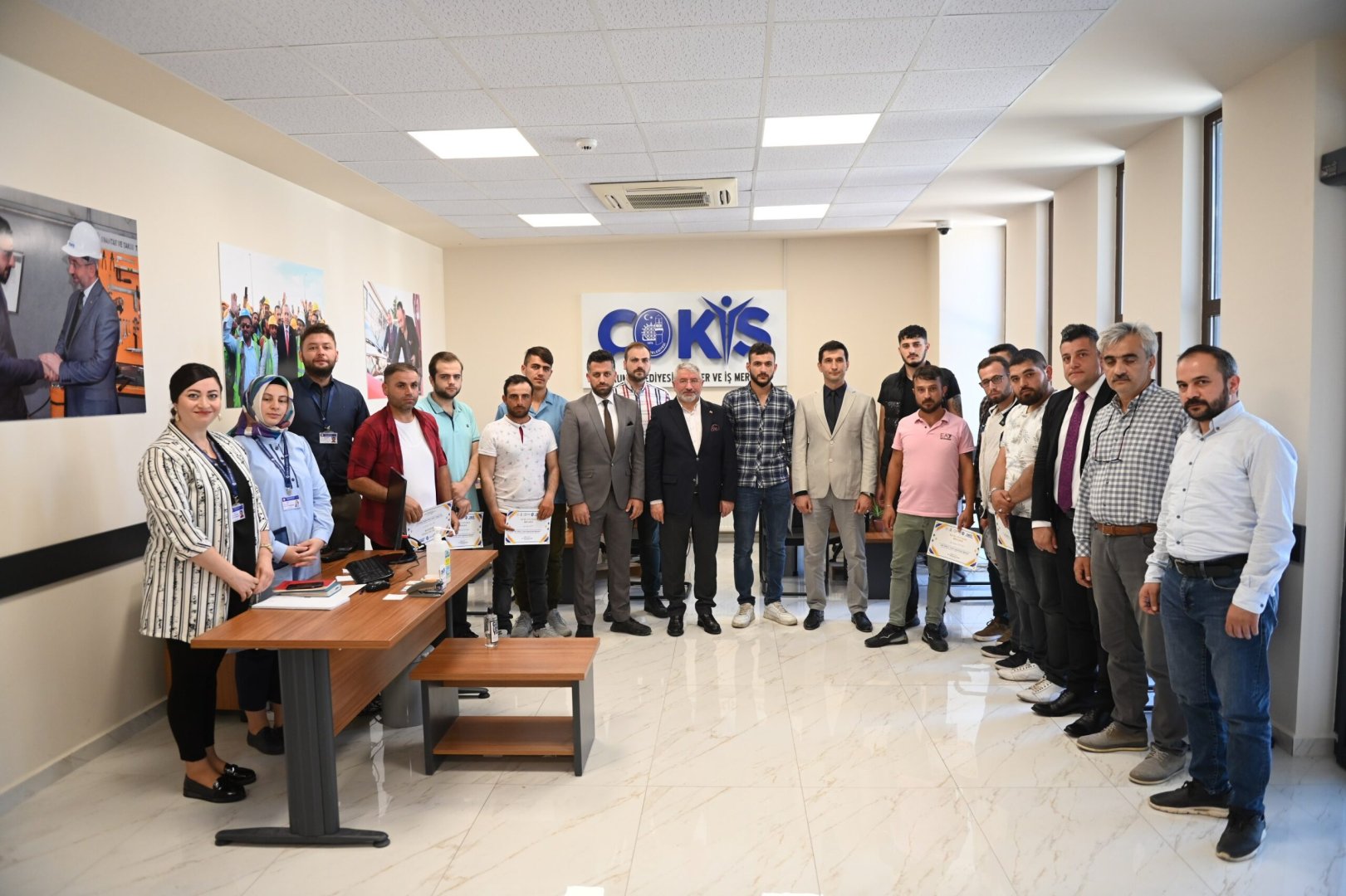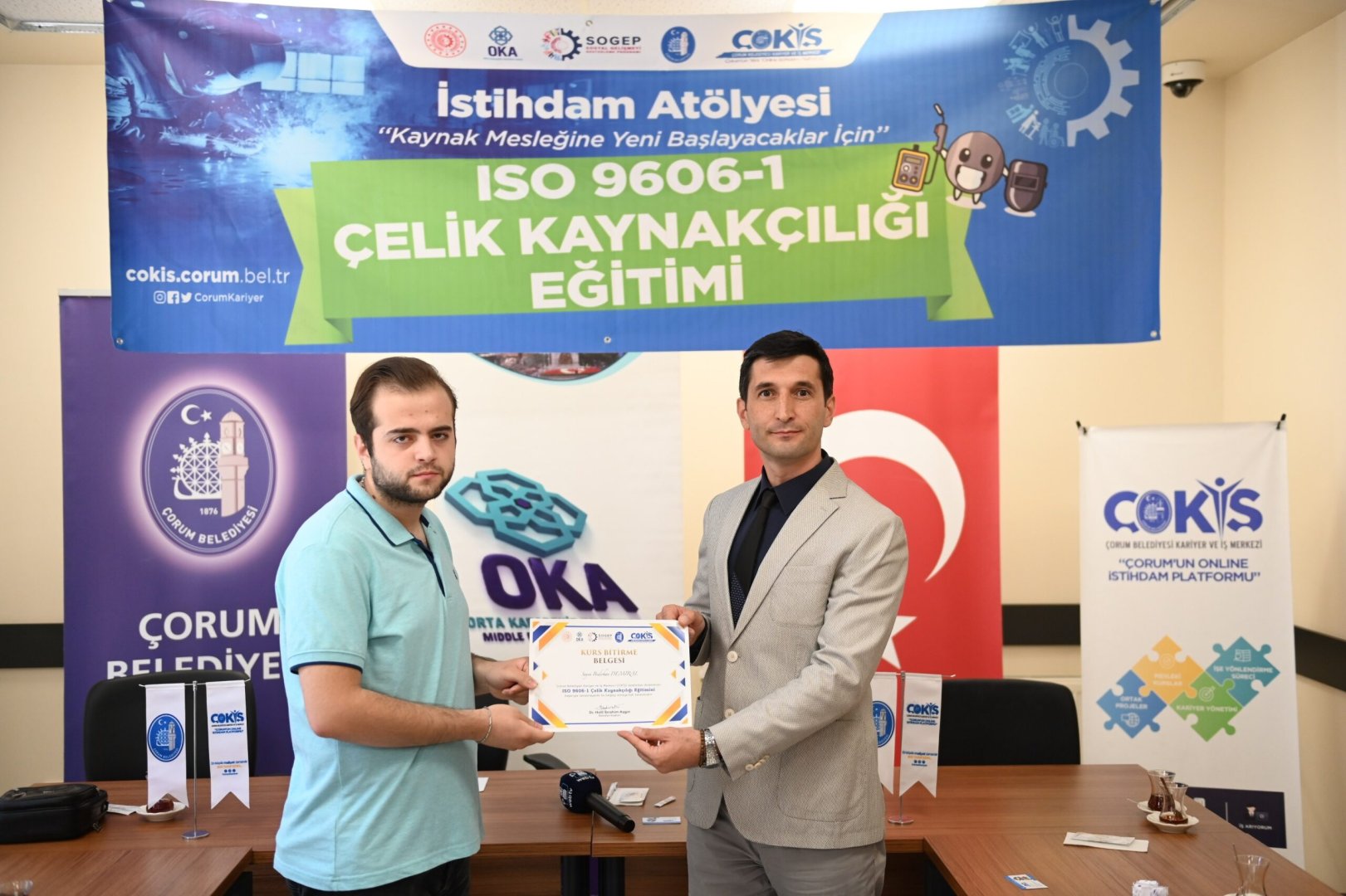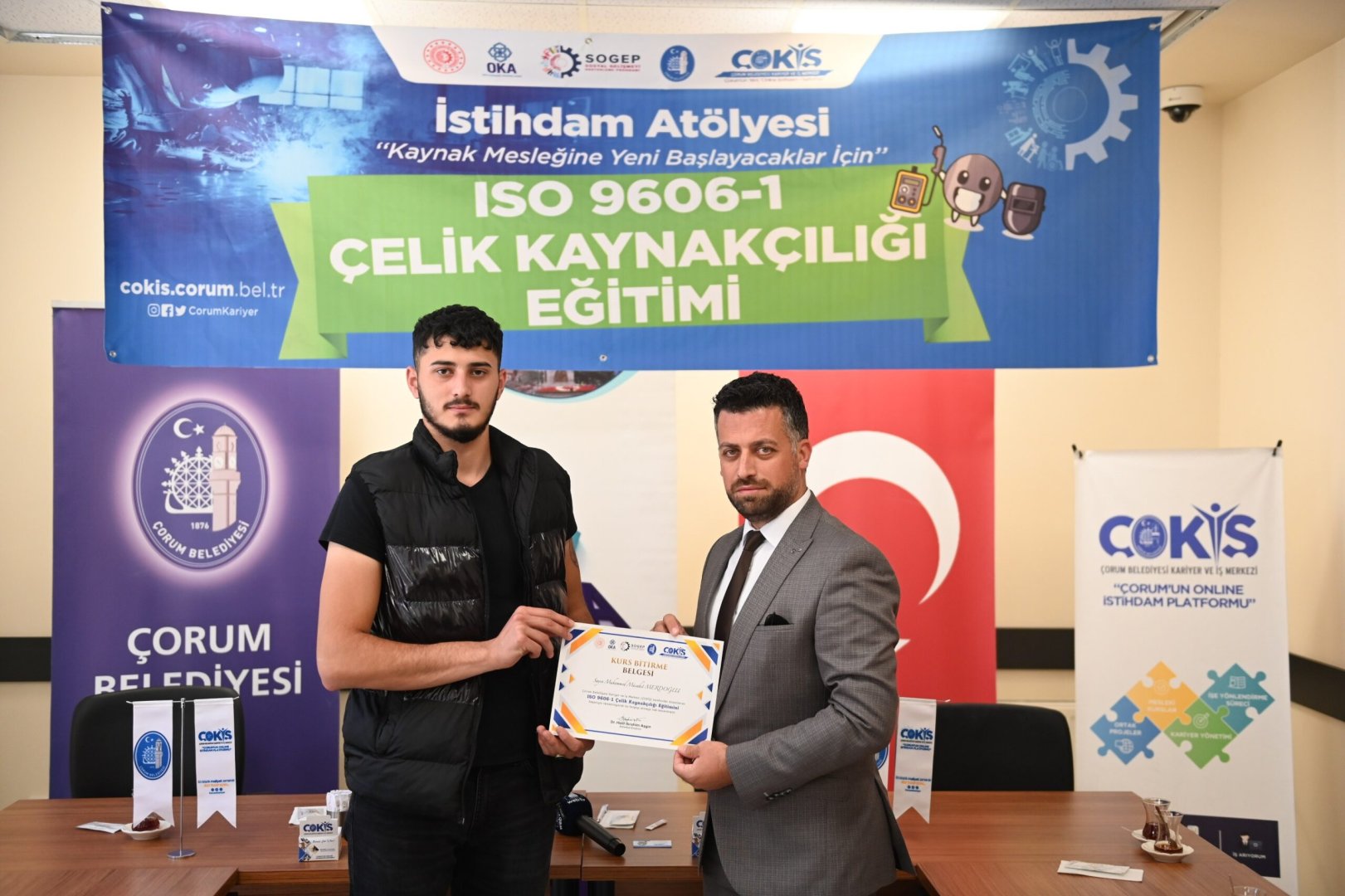 Çorum sanayinin kalifiye eleman ihtiyacı İstihdam Atölyesi ile gideriliyor. İşverenle iş arayanları buluşturarak istihdama büyük katkı sağlayan ÇOKİŞ, kalifiye elemanları sektöre hazırlıyor. İstihdam Atölyesinde, teorik ve uygulama eğitimlerini tamamlayarak sertifika almaya hak kazanan çelik kaynakçılık kursiyerleri, Belediye Başkanımız Dr. Halil İbrahim Aşgın’ında katıldığı törenle sertifikalarına kavuştu.