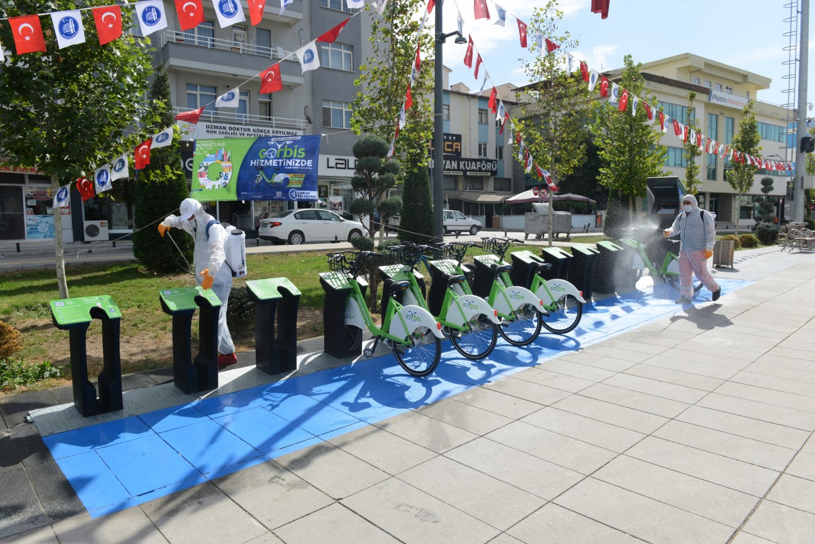 Pandemi sürecine girildiği günden itibaren temizlik ve hijyene yönelik çalışmalarını aralıksız sürdüren Belediyemiz, halkın sağlığını korumaya yönelik çalışmalarına devam ediyor. Belediyemizin uygulamaya koyduğu yeni projelerinden biri olan ÇORBİS uygulamasında da sağlık ve hijyen ön planda tutuluyor. Bu kapsamda ÇORBİS terminallerinde bulunan bisikletler düzenli olarak dezenfenkte edilerek kullanıma sunuluyor.