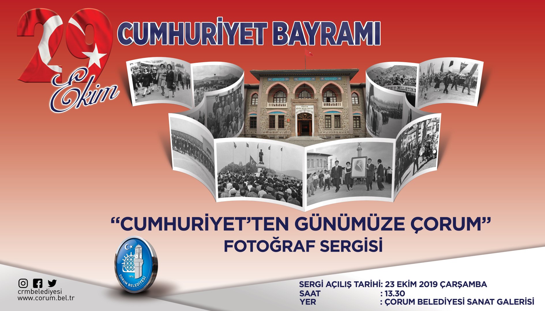 Cumhuriyet’in 96. Yılı kutlamaları etkinlikleri çerçevesinde belediyemiz tarafından “Cumhuriyet’ten Günümüze Çorum” konulu fotoğraf sergisi düzenlenecek. 23 Ekim 2019 Çarşamba günü açılacak sergiye tüm Çorum halkını davet eden Belediye Başkanımız Dr. Halil İbrahim Aşgın “Türkiye Cumhuriyeti’nin resmen kurulduğu tarih olan 29 Ekim’i bu yıl da çeşitli etkinliklerle kutlayacağız. Çorum Belediyesi olarak Sanat Galerisi içerisinde açacağımız sergimizde Çorum’un eski fotoğraflarının yanı sıra Çorum’da yapılmış olan eski milli bayramların da fotoğrafları yer alacak. 23 Ekim 2019 Saat 13.30’da açılacak olan fotoğraf sergimiz 30 Ekim 2019 tarihine kadar açık kalacak. Tüm hemşehrilerimizi sergiye davet ediyoruz” dedi.