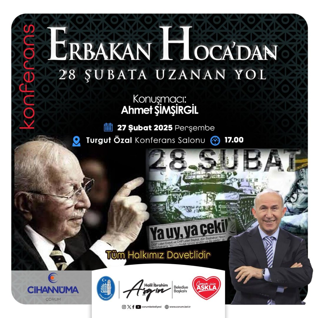 Etkinliklere Çorum halkını davet eden Belediye Başkanı Dr. Halil Aşgın “Prof. Dr. Necmettin Erbakan, siyasi kimliğinin yanı sıra bir düşünce adamı ve lider olarak Türkiye’nin modern tarihinde derin izler bırakmıştır. Onun adalet, refah ve bağımsızlık temelli düşünceleri, bugün hala birçok kesim tarafından benimsenmekte ve yaşatılmaktadır. Prof.Dr. Necmettin Erbakan'ın vefatının 14. yılı ve 28 Şubat postmodern darbesinin 28.'inci yılı nedeniyle düzenlediğimiz, Prof. Dr. Ahmet Şimşirgil’in katılacağı "Erbakan Hoca'dan 28 Şubat'a Uzanan Yol" konulu konferansımıza tüm hemşehrilerimizi bekliyoruz. Öte yandan Necmettin Erbakan Hocamızın vefatının seneidevriyesi nedeniyle 28 Şubat Cuma akşamı ilk teravih namazı öncesinde Akşemseddin Cami’nde Mevlid programı düzenleyeceğiz. Bu vesileyle Milli Görüş Hareketi’nin kurucusu ve Türkiye siyasi tarihinin önemli isimlerinden Prof. Dr. Necmettin Erbakan hocamızı rahmetle yâd ediyorum” dedi.