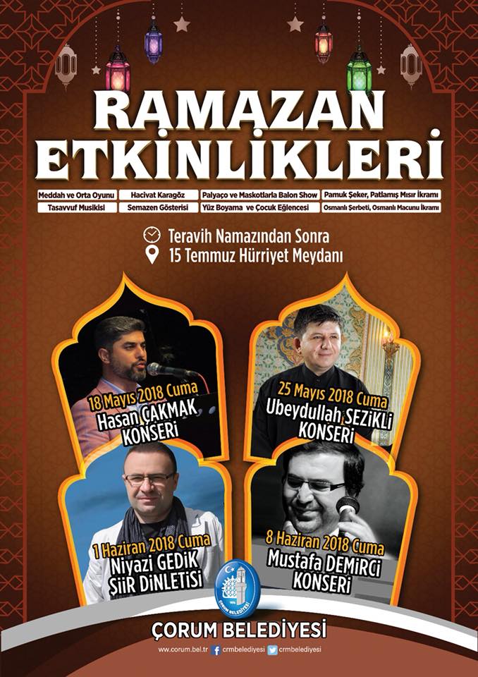 Ramazan ayı boyunca çeşitli etkinliklerle Ramazan ayını, Ramazanın ruhuna uygun bir şekilde ifa edeceklerini belirten Belediye Başkanı Zeki Gül: “Çorum Belediyesi tarafından kurulacak olan iftar çadırında ihtiyaç sahiplerimize 30 gün boyunca iftarlar verilecek. Bu iftarların yanı sıra mahalle iftarları, çocuk iftarı ve ilahi konserleri ve şiir dinletisi düzenleyeceğiz. Ramazanın 3.günü akşamı teravih namazı öncesi ve sonrasında Hürriyet Meydanı’nda Hacivat-Karagöz, meddah ve orta oyunu, tasavvuf musikisi, semazen gösterisi, balon şov, yüz boyama gibi çocuklar için eğlenceler düzenleyeceğiz. Ramazan etkinliği için meydana gelen vatandaşlarımıza Osmanlı şerbeti, Osmanlı macunu, pamuk şeker ve patlamış mısır ikramında bulunacağız. Bu zamanda 4 konserimiz olacak. 8 Mayıs akşamı Hasan Çakmak, 25 Mayıs akşamı Ubeydullah Sezikli, 1 Haziran akşamı Niyazi Gedik Şiir Dinletisi, 8 Haziran akşamı ise Mustafa Demirci halkımıza konser verecek” dedi.