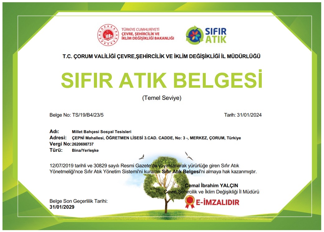 Çorum Belediyesi Sosyal Tesisleri, Sıfır Atık Yönetim Sistemi ile istenen kriterleri yerine getirerek Çevre Şehircilik ve İklim Değişikliği Bakanlığından “Sıfır Atık” belgesi aldı.