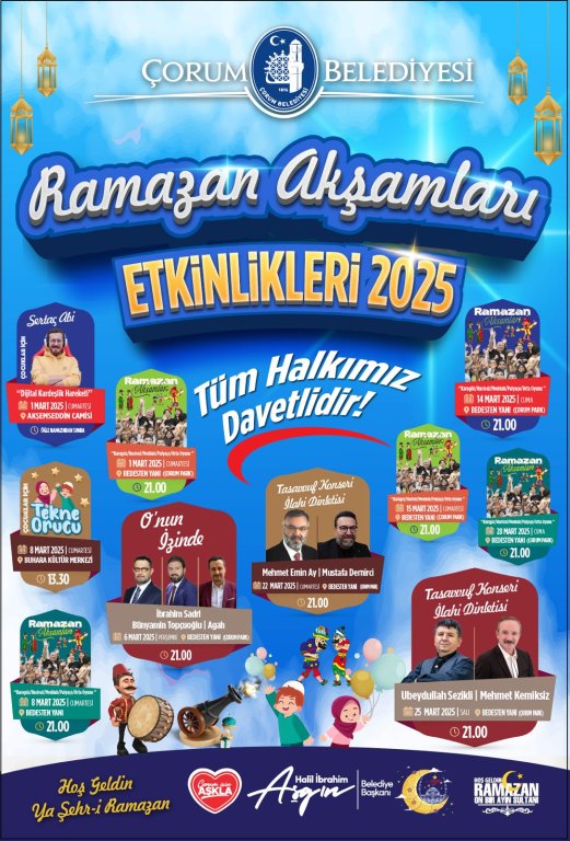 Etkinlikler, 1 Mart Cumartesi günü Akşemseddin Cami’nde öğle namazının ardından çocukların Sertaç Abisi “Dijital kardeşlik Hareketi” programıyla başlayacak. Aynı gün saat 21.00’de ise Bedesten yanında bulunan Çorum Park’ta Ramazan Akşamları programı gerçekleştirilecek. 6 Mart akşamı saat 21.00’de Şiir ve Ezgi Gecesi’nde İbrahim Sadri, Bünyamin Topçuoğlu ve Dr. Agah Terzi Çorumlularla buluşacak. 8 Mart Cumartesi günü saat 13.30’da Buhara Kültür Merkezi’nde Çocuklar için Tekne Orucu etkinliği,  1, 8, 14, 15 ve 28 Mart saat 21.00’de Ramazan Akşamları programları, 22 Mart Cumartesi akşamı saat 21.00’de Mehmet Emin Ay ve Mustafa Demirci, 25 Mart Salı Akşamı yine aynı saatte Ubeydullah Sezikli ve Mehmet Kemiksiz ile Tasavvuf Konseri-İlahi Dinletisi etkinlikleri gerçekleştirilecek.