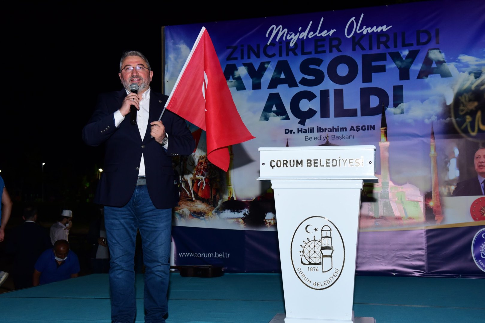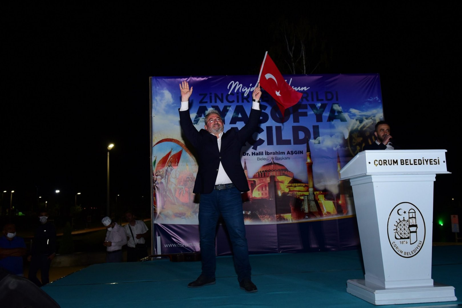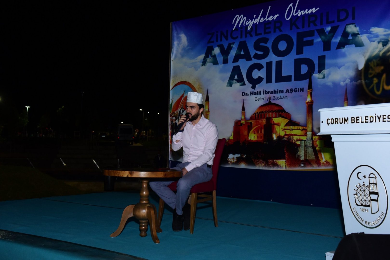 Çorum Belediyesi, İstanbul’un fethinin simgesi olan Ayasofya’nın 86 yıl sonra ibadete açılması nedeniyle kutlama etkinliği düzenledi. Millet Bahçesinde düzenlenen etkinliğe Çorum halkının ilgisi hayli yoğun oldu.