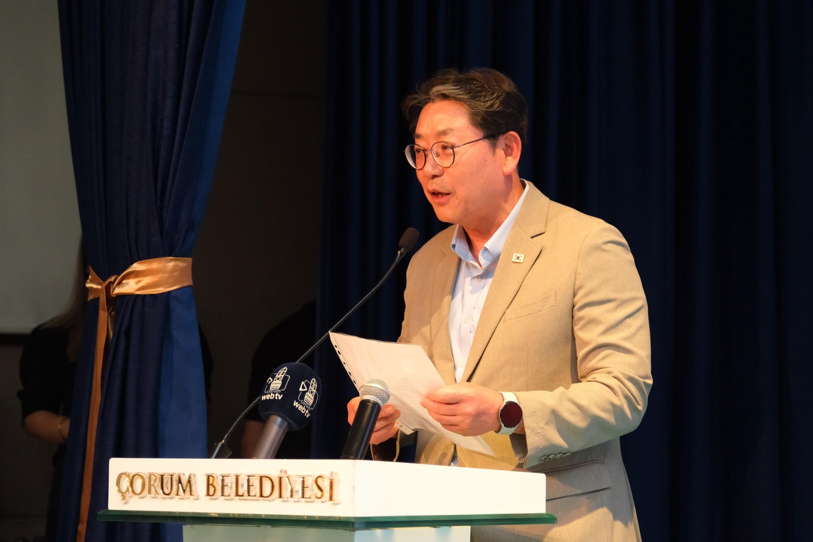 Çorum Belediye Başkanı Dr. Halil İbrahim Aşgın da konuşmasında, Türkiye ile Güney Kore arasında tarihi ve kültürel bağlar bulunduğuna dikkat çekerek, “Güney Kore topraklarında şehitlerimizin kanı var. Biz aynı zamanda kan kardeşiyiz. 2018 yılında kardeşliğimizi ilan ettiğimiz Gimhae ile de bu süreçte sosyal ve kültürel birçok ortak yönümüz bulunduğunu gördük. Geçtiğimiz yıl Gimhae ve Seul’de düzenlediğimiz topraklarımızdan çıkan Hitit eserlerinin yer aldığı sergi büyük ilgi gördü. Bu sergilere verdikleri destekten dolayı Gimhae Belediye Başkanı’na ve emeği geçen herkese teşekkür ediyorum. Şu anda kültürel boyutuyla devam eden işbirliğimizin ticaret, ekonomi, sanayi ve eğitim alanında da güçlenerek devam etmesini arzu ediyorum.” şeklinde konuştu.