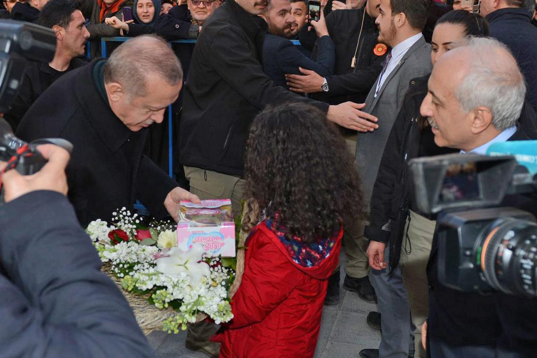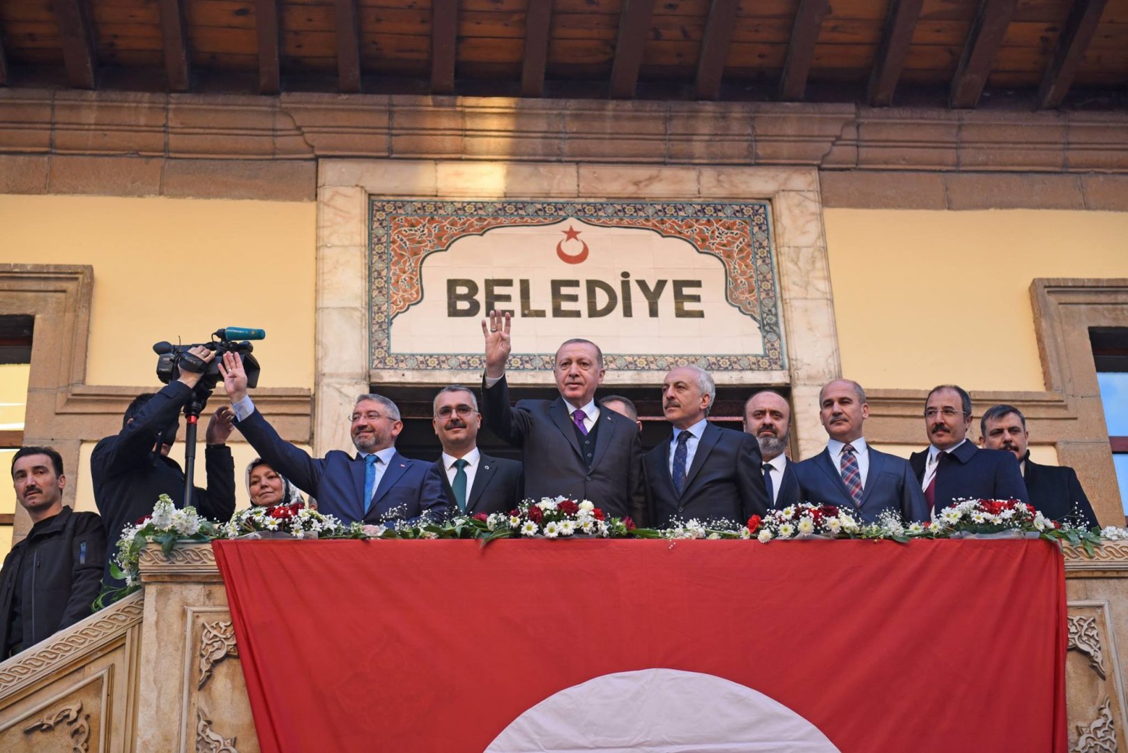 Belediyeye gelişinde Belediye Başkanı Zeki Gül tarafından çiçekle karşılanan Erdoğan, Belediye önünde kendisini bekleyen vatandaşları selamladı.Cumhurbaşkanı Recep Tayyip Erdoğan daha sonra makama geçerek belediye özel defterini imzaladı. Belediye Başkanı Zeki Gül’den belediye çalışmaları hakkında bilgi alan Erdoğan Başkan Gül’e çini tabak hediye etti.