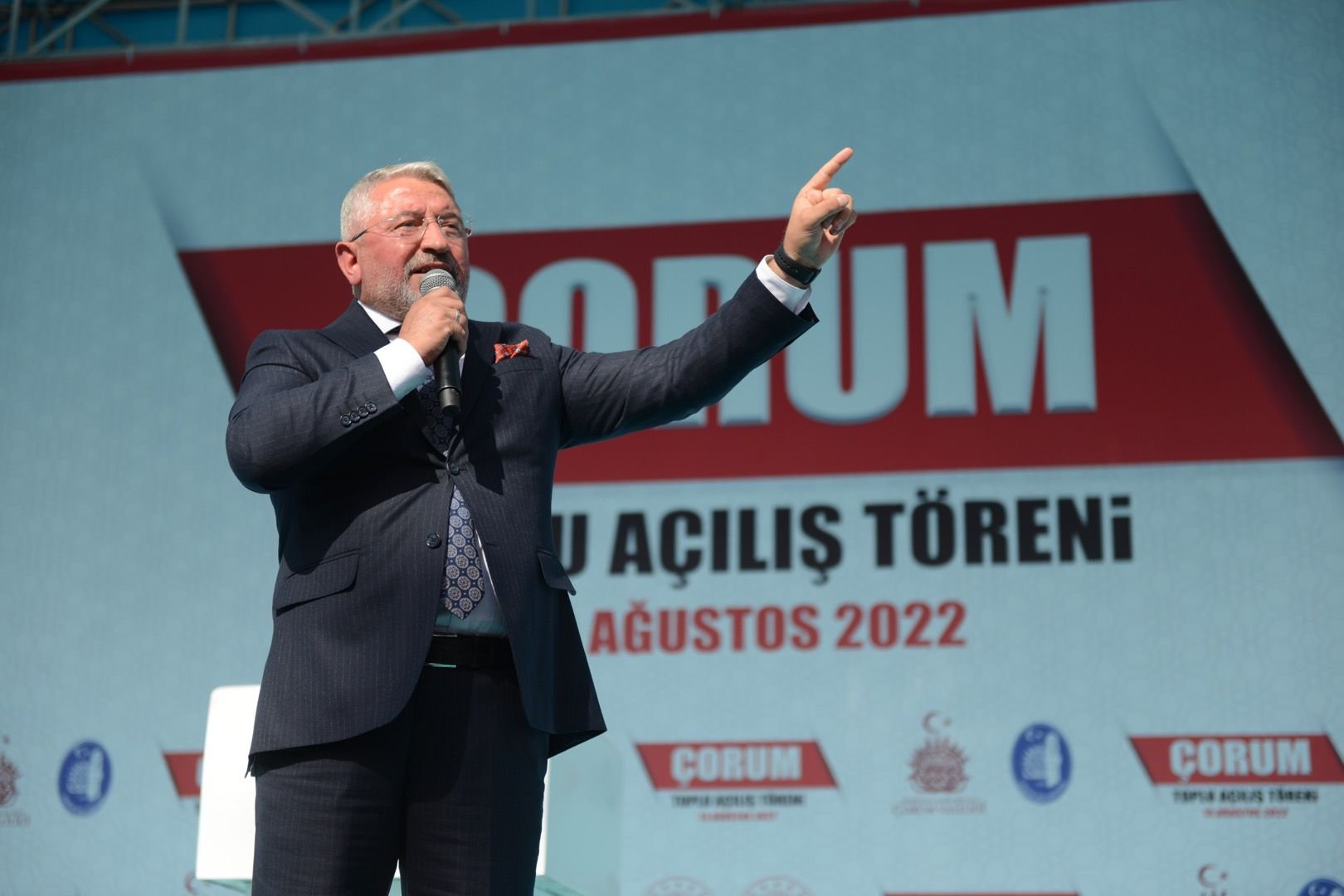 Cumhurbaşkanı Erdoğan, “Çorum Belediyesi, şehrimiz için aşkla çalışarak taş üstüne taş koymaya devam ediyor. Belediyemizin tamamladığı Recep Tayyip Erdoğan Caddesi’ni, yarı olimpik yüzme havuzlarını, Veli Paşa Hanı ve Dikiciler Arastası Restorasyonu, cenaze ve defin işlemleri merkezi, millet kıraathanelerini, semt sahalarını resmen hizmete alıyoruz. İl Özel İdaremiz toplam 729 milyon lira yatırım bedeli ile Çorum ve köylerine sulama tesisleri, su işleri, içme göletleri, 112 Acil Çağrı Merkezi Müdürlüğü hizmet binasını kazandırdı. Bu eserlerin resmi açılışını da bugün yapıyoruz.” şeklinde konuştu.