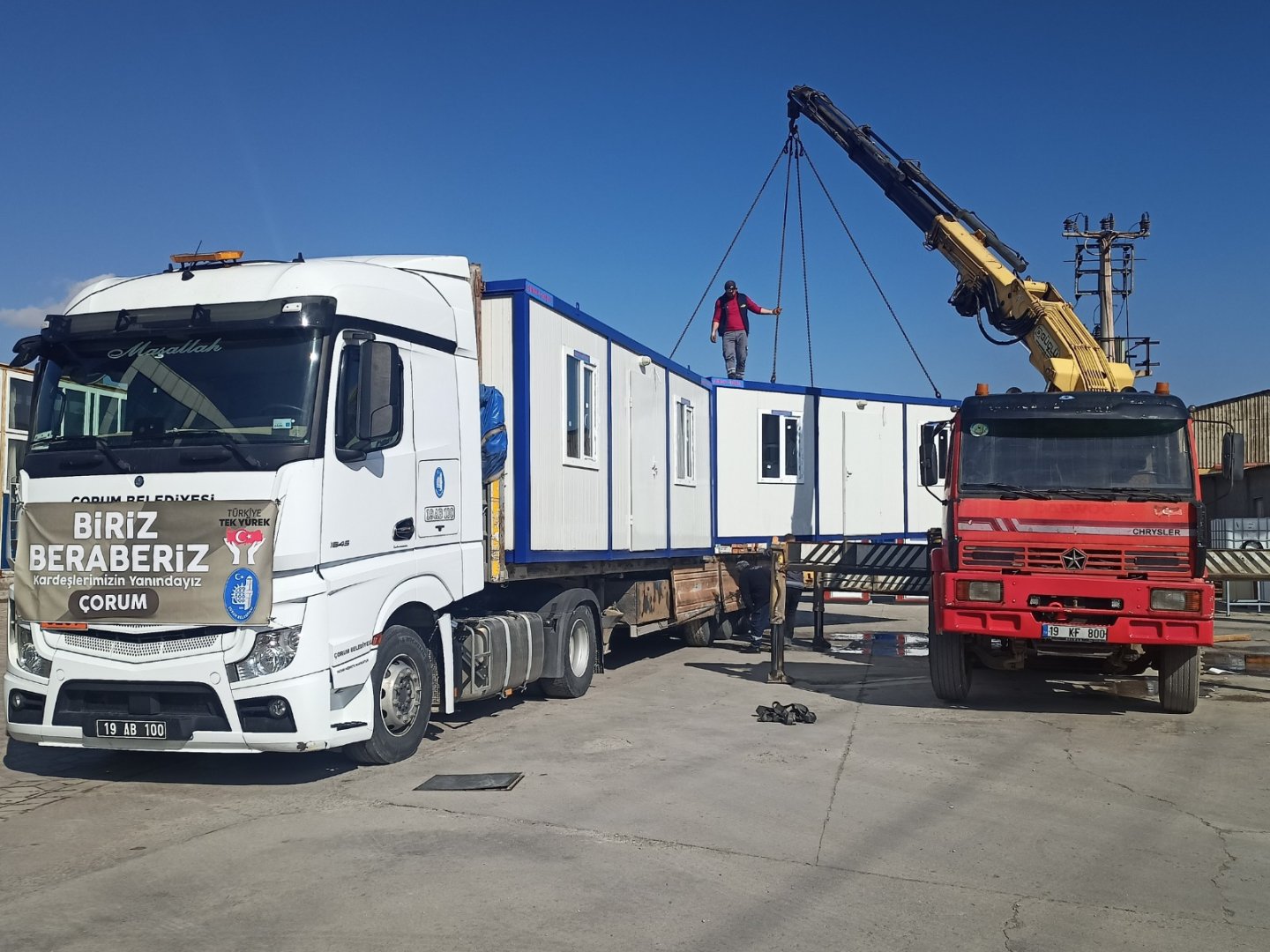 Çorum Belediyesi, hayırsever Çorum halkının da desteğiyle depremin yaralarını sarıyor. Çadır, soba, seyyar tuvalet ve insani yardımların ardından şimdi de afet bölgesinin en büyük ihtiyaçlarından olan konteynerler deprem bölgesine gönderiliyor.