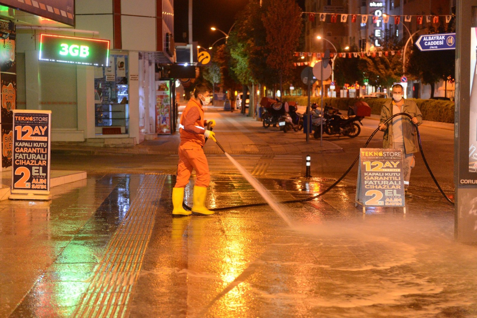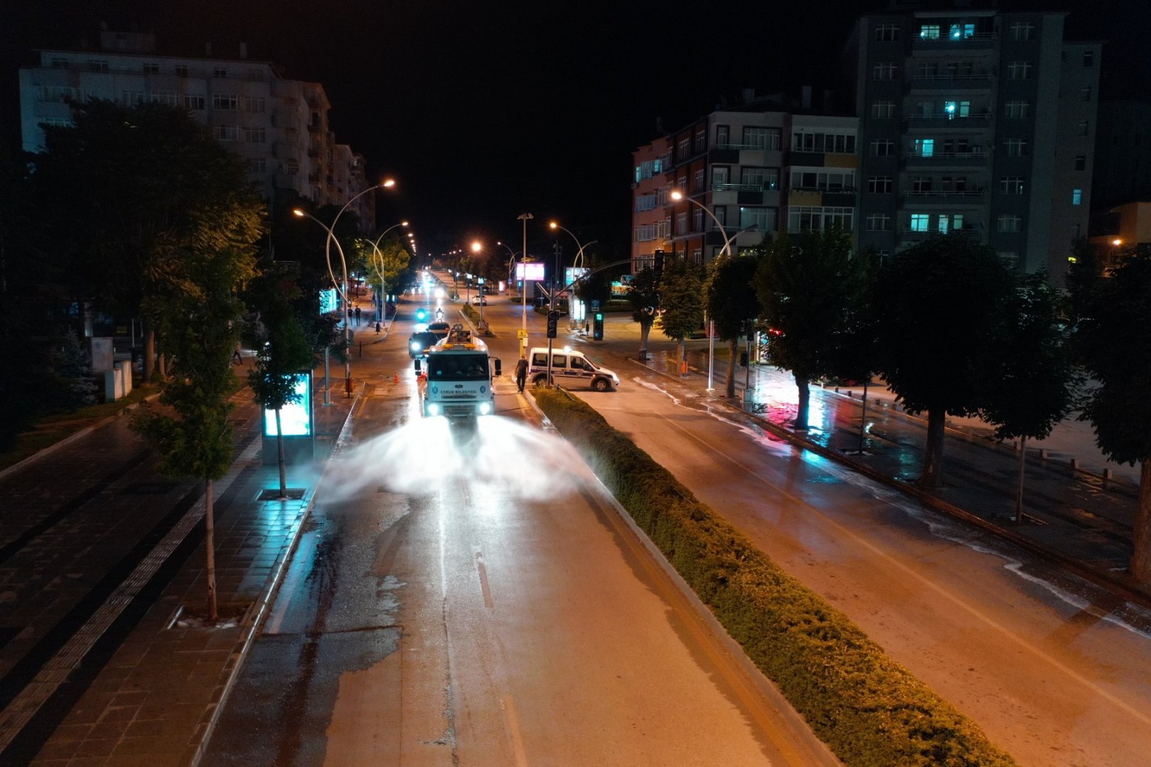 Dünyayı etkisi altına alan Covid-19 salgınının ortaya çıktığı ilk günden itibaren temizlik ve dezenfekte çalışmalarına ara vermeden devam eden belediyemiz, araç trafiğinin olmadığı saatlerde cadde ve sokaklarda da yıkama çalışması yapıyor. “Halkımızdan tek isteğimiz salgın döneminde maske, mesafe ve temizlik kurallarına dikkat etmeleridir.” diyen Belediye Başkanımız Dr. Halil İbrahim Aşgın, “Biz, Belediye olarak şehir genelinde, ülkemizde salgının ilk vakalarının ortaya çıktığı Mart ayından itibaren geniş çaplı yıkama ve dezenfekte çalışmalarına başlamıştık. Bu çalışmalarımıza o günden beri ara vermeden devam ediyoruz. Tüm okullarımızla başladığımız dezenfekte işlemlerimize özellikle halkımızın yoğun olarak kullandığı alanlardan olan parklar, camiler, mesire alanları, yaya kaldırımları, otobüsler, duraklar ve hatta konutların ortak kullanım alanları gibi yerlerle devam ediyoruz. Dezenfekte ekiplerimizle şehrin tamamında çalışmalarımızı özenle yürütüyoruz.” dedi. Başkan Aşgın, “Koronavirüs bizim alacağımız tedbirlerden daha güçlü değil; hemşehrilerimiz tedbiri elden bırakmasınlar. Biz sorumluluğumuzun bilincindeyiz ve Covid-19 ile mücadelemize bu bilinçle ara vermeden, mesai mefhumu gözetmeden tüm ekiplerimizle devam ediyoruz.” diye konuştu.