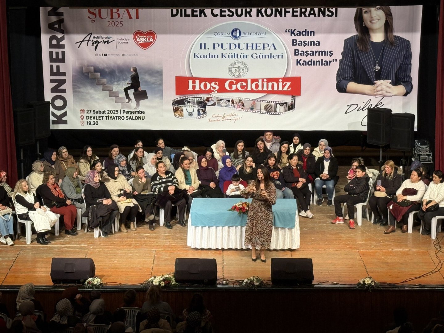 8 Mart Dünya Kadınlar Günü kutlamaları kapsamında düzenlenen 2. Puduhepa Kadın Kültür Günleri’nin kapanış konuğu Yazar Dilek Cesur oldu. Devlet Tiyatro Salonu’nda gerçekleştirilen “Kadın Başına Başarmış Kadınlar” konulu konferansa ilgi yoğun oldu. Konuşmasında kendi hayatından kesitler de anlatan Dilek Cesur kadınlardan kendilerine inanmalarını ve başarmak için mücadele etmeleri gerektiğini aktardı. Cesur’a konferansının ardından Çorum Valisi Ali Çalgan’ın eşi Halide Çalgan ve Belediye Başkanı Dr. Halil İbrahim Aşgın’ın eşi Feyza Aşgın tarafından çiçek ve hediye takdim edildi.
