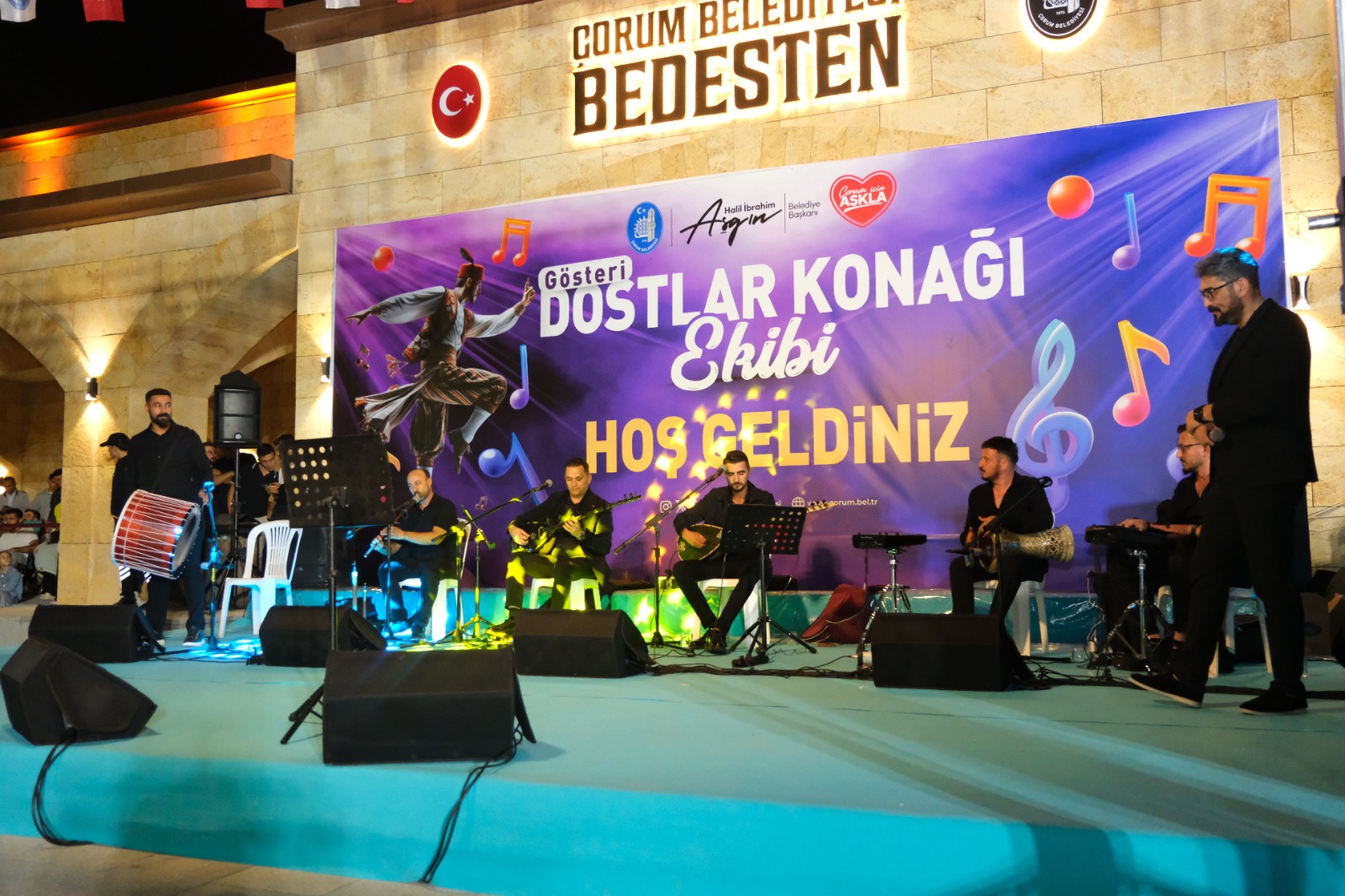 Bedesten önünde düzenlenen etkinlikte sahne alan Dostlar Konağı ve Grup Dostlar ekibi, Anadolu'nun zengin kültürel mirasının önemli bir parçası olan halk oyunları, halay ve birbirinden güzel türkülerle katılımcılara unutulmaz bir akşam yaşattı. Renkli görüntülere sahne olan gösteriye Çorum Belediye Başkanı Dr. Halil İbrahim Aşgın, Belediye Başkan Yardımcısı İsmail Yağbat, AK Parti Gençlik Kolları Başkanı Onur Civan ve çok sayıda vatandaş katıldı.